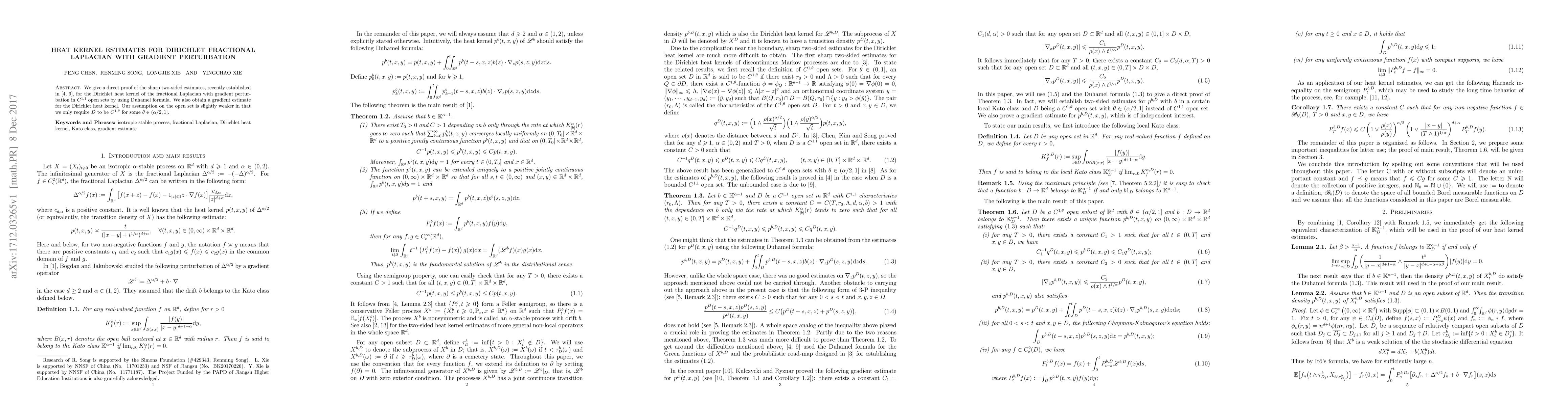 We give a direct proof of the sharp two-sided estimates, recently established in [4,9], for the Dirichlet heat kernel of the fractional Laplacian with gradient perturbation in $C^{1, 1}$ open sets by using Duhamel formula. We also obtain a gradient estimate for the Dirichlet heat kernel. Our assumption on the open set is slightly weaker in that we only require $D$ to be $C^{1,\theta}$ for some $\theta\in (\alpha/2, 1]$.