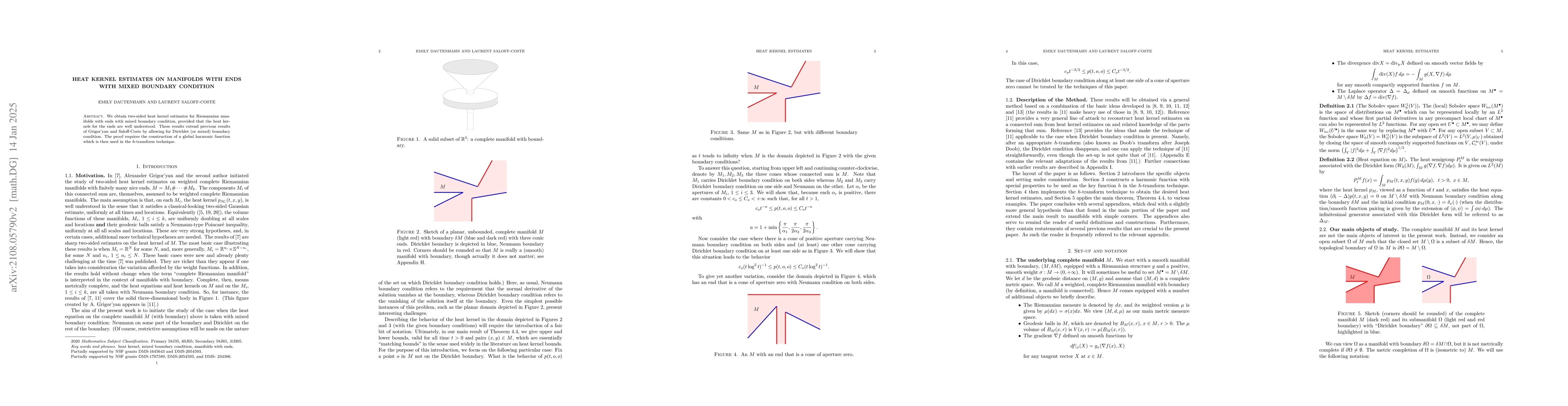 This research derives two-sided heat kernel estimates for Riemannian manifolds with ends having mixed boundary conditions, extending prior work by Grigor'yan and Saloff-Coste to include Dirichlet boundary conditions. The proof involves constructing a global harmonic function for use in the h-transform technique.