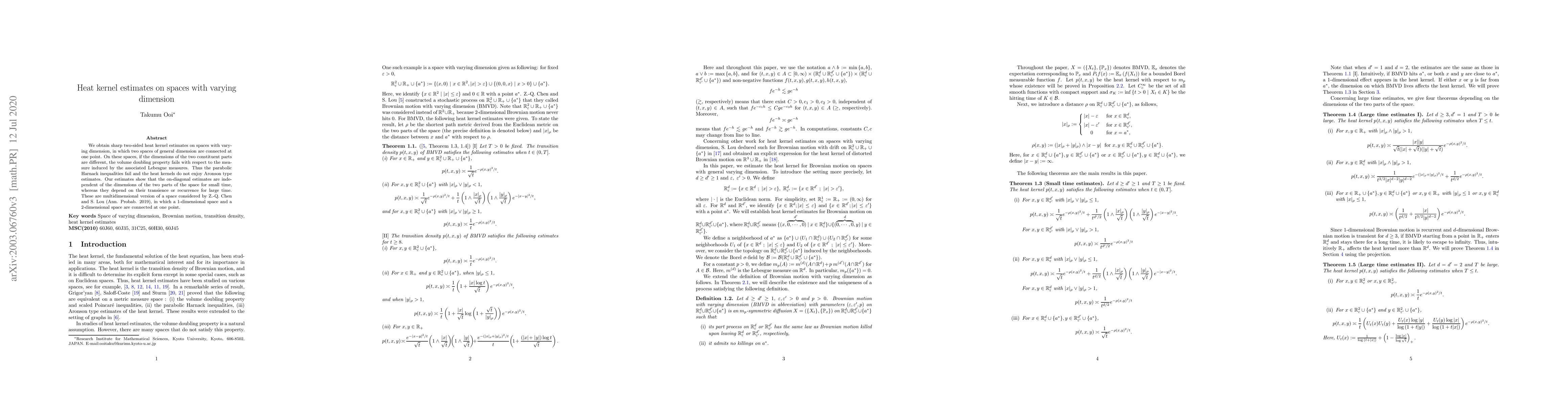 This paper provides sharp two-sided heat kernel estimates for spaces with varying dimensions connected at a single point, where the volume doubling property and parabolic Harnack inequalities fail. The on-diagonal estimates are dimension-independent for small time but depend on transience or recurrence for large time.