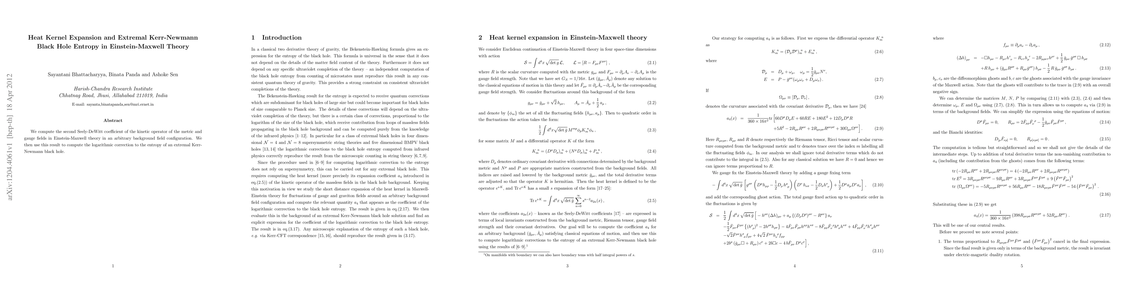 This paper calculates the second Seely-DeWitt coefficient for Einstein-Maxwell theory, applying it to derive the logarithmic correction in the entropy of an extremal Kerr-Newmann black hole. The findings provide deeper insights into black hole thermodynamics.