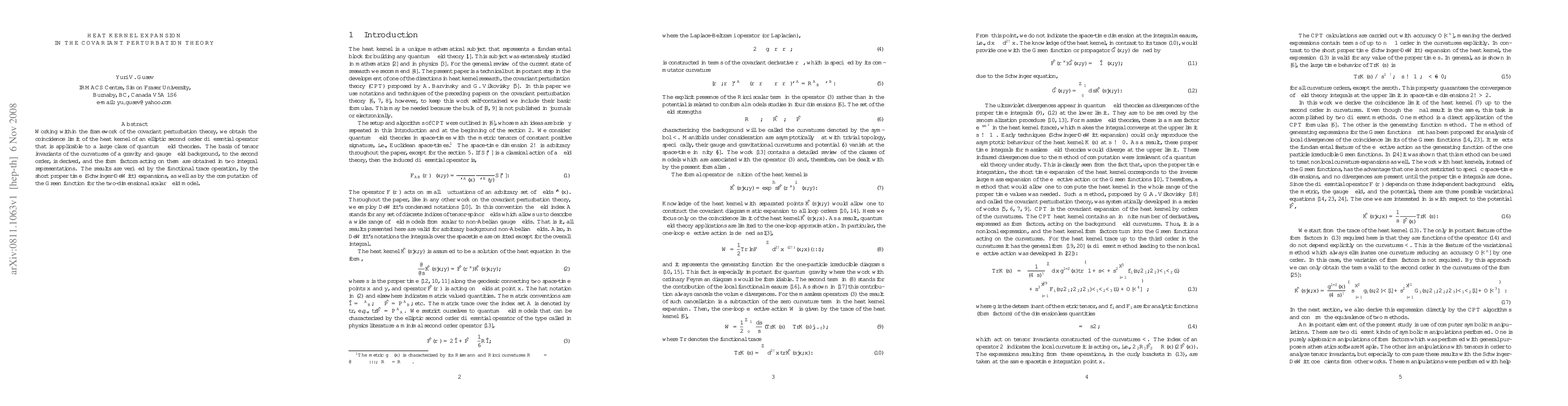 This paper derives the coincidence limit of the heat kernel for an elliptic differential operator in covariant perturbation theory, providing a basis of tensor invariants for gravity and gauge fields up to second order. The results are validated through functional trace operations, short proper time expansions, and computations for a two-dimensional scalar field model.