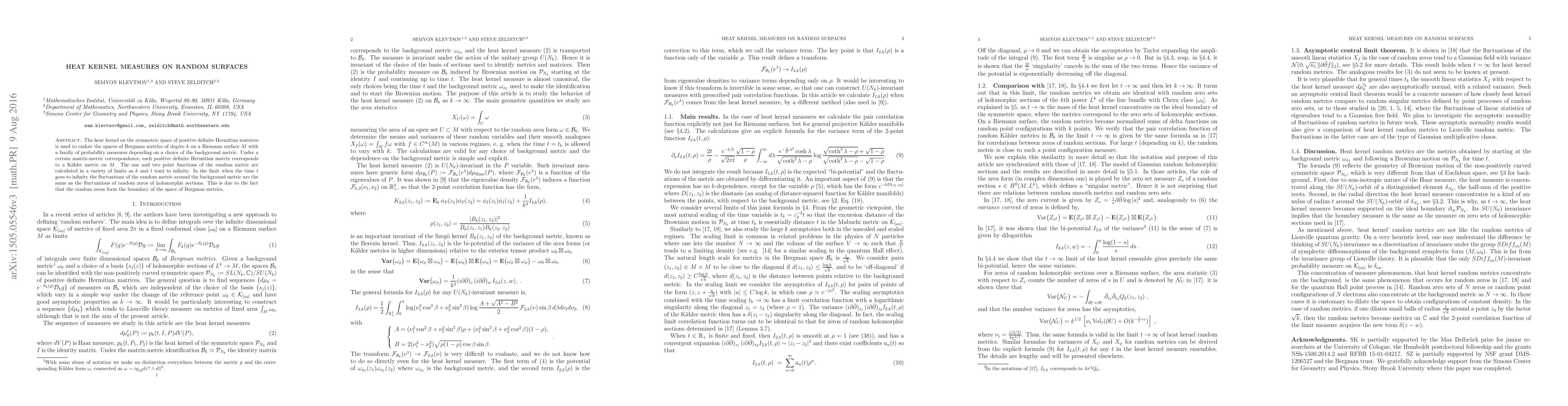 The heat kernel on the symmetric space of positive definite Hermitian matrices is used to endow the spaces of Bergman metrics of degree k on a Riemann surface M with a family of probability measures depending on a choice of the background metric. Under a certain matrix-metric correspondence, each positive definite Hermitian matrix corresponds to a Kahler metric on M. The one and two point functions of the random metric are calculated in a variety of limits as k and t tend to infinity. In the limit when the time t goes to infinity the fluctuations of the random metric around the background metric are the same as the fluctuations of random zeros of holomorphic sections. This is due to the fact that the random zeros form the boundary of the space of Bergman metrics.