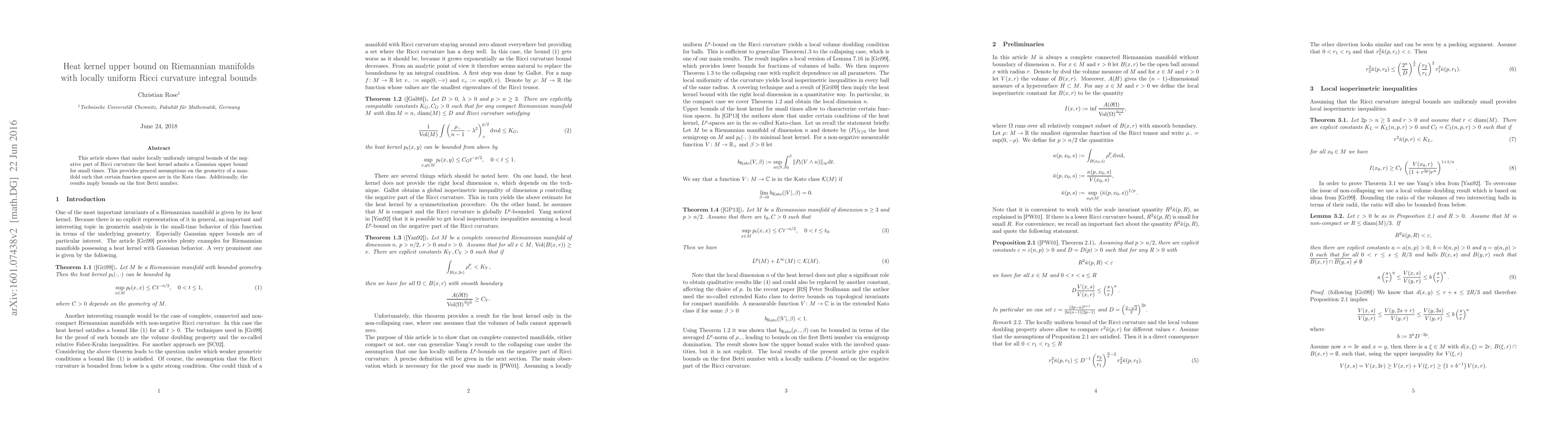 Summary: This paper demonstrates that locally uniform integral bounds on the negative Ricci curvature lead to a Gaussian upper bound for the heat kernel at small times, establishing conditions for function spaces in the Kato class and providing implications for the first Betti number.
