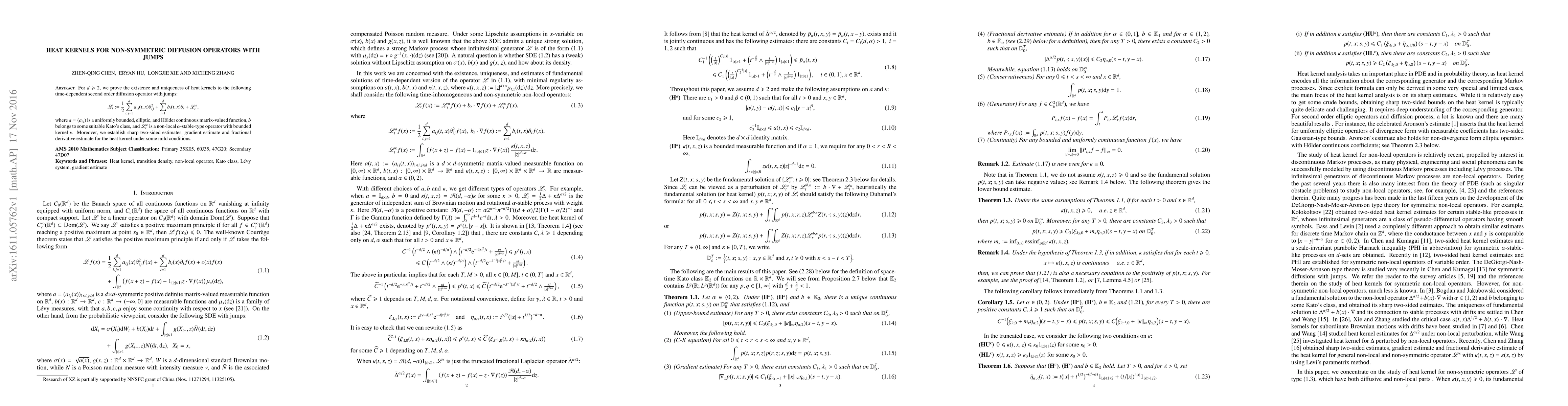 This paper establishes the existence and uniqueness of heat kernels for time-dependent second-order diffusion operators with jumps, combining elliptic differential operators and non-local $\alpha$-stable operators. It also provides sharp estimates, including gradient and fractional derivative estimates, using an analytic approach supplemented by probabilistic techniques.