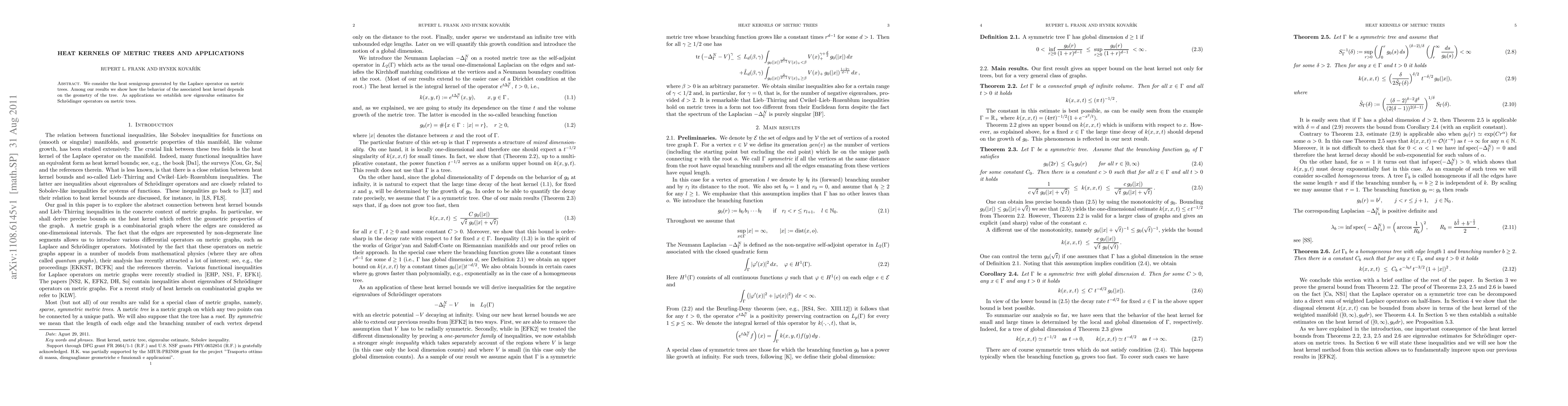Summary: This paper investigates the heat kernel behavior on metric trees, revealing its dependence on tree geometry, and applies these findings to derive new eigenvalue estimates for Schrödinger operators on metric trees.