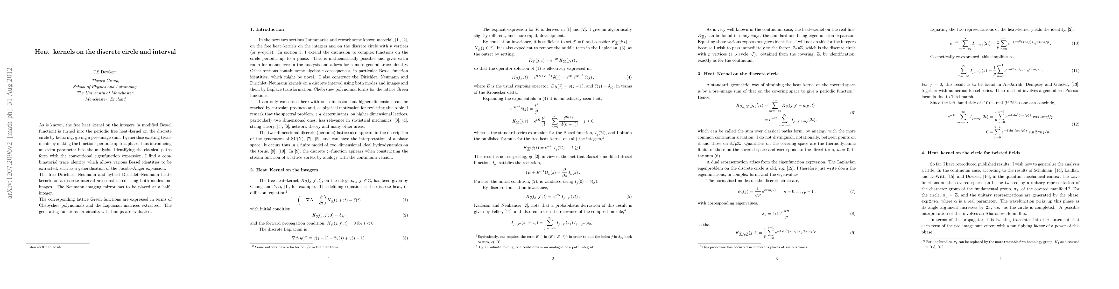 As is known, the free heat-kernel on the integers (a modified Bessel function) is turned into the periodic free heat-kernel on the discrete circle by factoring, giving a pre-image sum. I generalise existing treatments by making the functions periodic up to a phase, thus introducing an extra parameter into the analysis. Identifying the classical paths form with the conventional eigenfunction expression, I find a combinatorial trace identity which allows various Bessel identities to be extracted, such as a generalisation of the Jacobi-Anger expansion.The free Dirichlet, Neumann and hybrid Dirichlet-Neumann heat-kernels on a discrete interval are constructed using both modes and images. The Neumann imaging mirror has to be placed at a half-integer. The corresponding lattice Green functions are expressed in terms of Chebyshev polynomials and the Laplacian matrices extracted. The generating functions for circuits with bumps are evaluated.