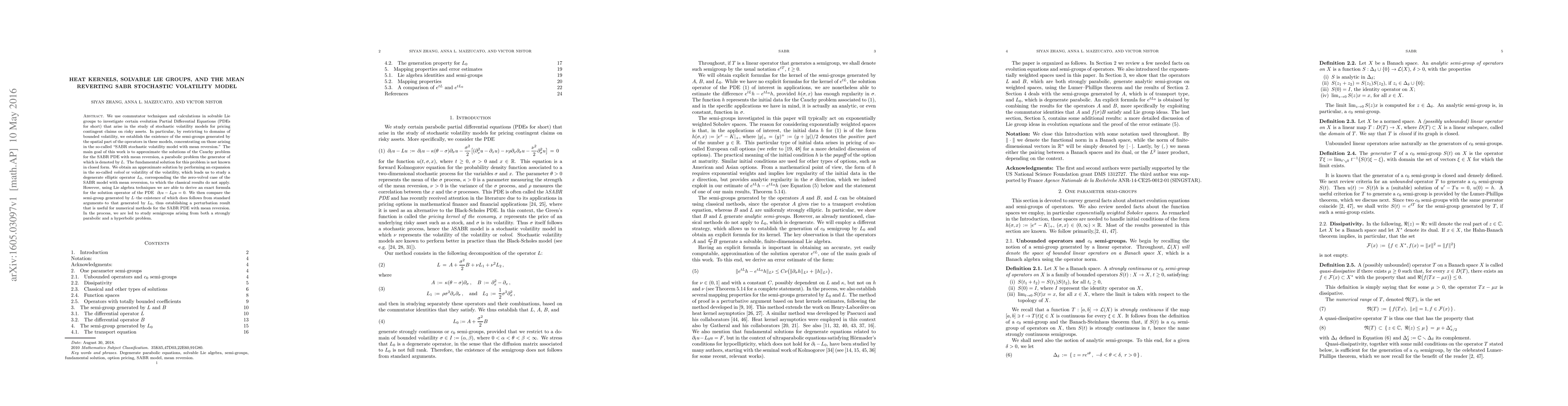 We use commutator techniques and calculations in solvable Lie groups to investigate certain evolution Partial Differential Equations (PDEs for short) that arise in the study of stochastic volatility models for pricing contingent claims on risky assets. In particular, by restricting to domains of bounded volatility, we establish the existence of the semi-groups generated by the spatial part of the operators in these models, concentrating on those arising in the so-called "SABR stochastic volatility model with mean reversion." The main goal of this work is to approximate the solutions of the Cauchy problem for the SABR PDE with mean reversion, a parabolic problem the generator of which is denoted by $L$. The fundamental solution for this problem is not known in closed form. We obtain an approximate solution by performing an expansion in the so-called volvol or volatility of the volatility, which leads us to study a degenerate elliptic operator $L_0$, corresponding the the zero-volvol case of the SABR model with mean reversion, to which the classical results do not apply. However, using Lie algebra techniques we are able to derive an exact formula for the solution operator of the PDE $\partial_t u - L_0 u = 0$. We then compare the semi-group generated by $L$--the existence of which does follows from standard arguments--to that generated by $L_0$, thus establishing a perturbation result that is useful for numerical methods for the SABR PDE with mean reversion. In the process, we are led to study semigroups arising from both a strongly parabolic and a hyperbolic problem.