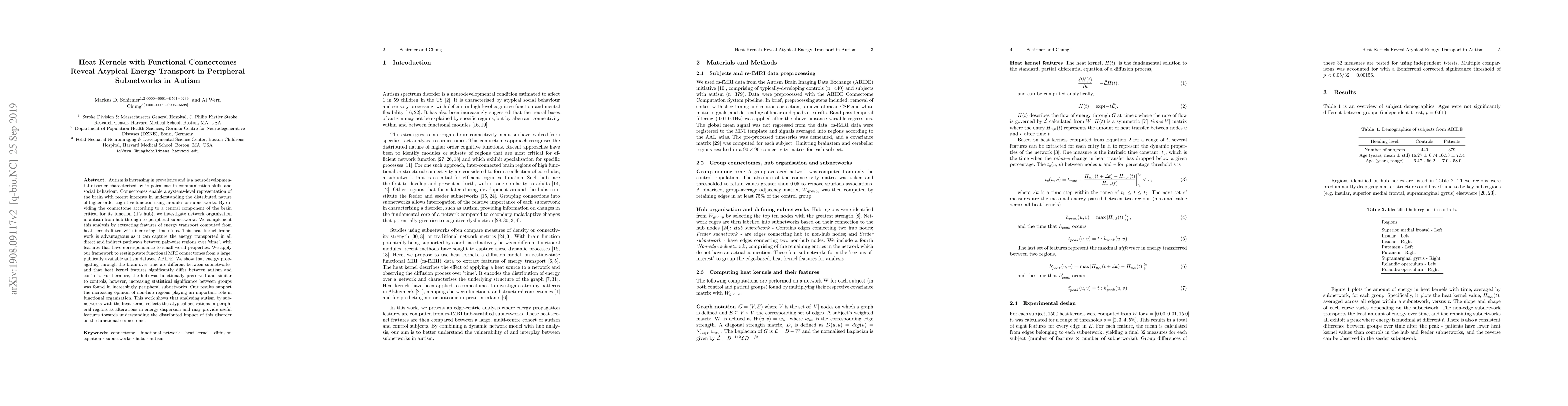 Autism is increasing in prevalence and is a neurodevelopmental disorder characterised by impairments in communication skills and social behaviour. Connectomes enable a systems-level representation of the brain with recent interests in understanding the distributed nature of higher order cognitive function using modules or subnetworks. By dividing the connectome according to a central component of the brain critical for its function (it's hub), we investigate network organisation in autism from hub through to peripheral subnetworks. We complement this analysis by extracting features of energy transport computed from heat kernels fitted with increasing time steps. This heat kernel framework is advantageous as it can capture the energy transported in all direct and indirect pathways between pair-wise regions over 'time', with features that have correspondence to small-world properties. We apply our framework to resting-state functional MRI connectomes from a large, publically available autism dataset, ABIDE. We show that energy propagating through the brain over time are different between subnetworks, and that heat kernel features significantly differ between autism and controls. Furthermore, the hub was functionally preserved and similar to controls, however, increasing statistical significance between groups was found in increasingly peripheral subnetworks. Our results support the increasing opinion of non-hub regions playing an important role in functional organisation. This work shows that analysing autism by subnetworks with the heat kernel reflects the atypical activations in peripheral regions as alterations in energy dispersion and may provide useful features towards understanding the distributed impact of this disorder on the functional connectome.