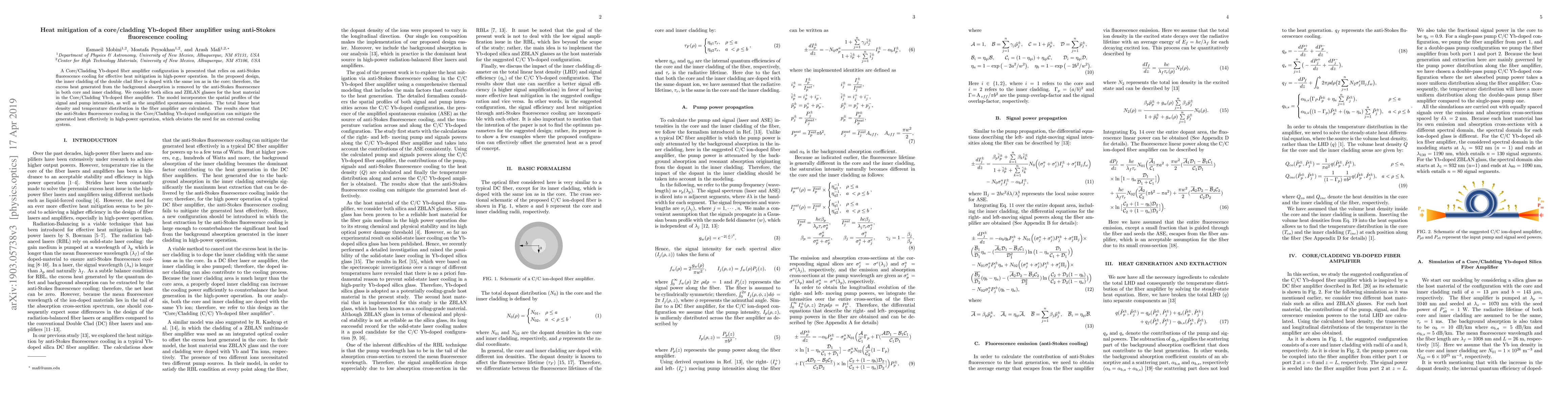A Core/Cladding Yb-doped fiber amplifier configuration is presented that relies on anti-Stokes fluorescence cooling for effective heat mitigation in high-power operation. In the proposed design, the inner cladding of the double clad fiber is doped with the same ion as in the core; therefore, the excess heat generated from the background absorption is removed by the anti-Stokes fluorescence in both core and inner cladding. We consider both silica and ZBLAN glasses for the host material in the Core/Cladding Yb-doped fiber amplifier. The model incorporates the spatial profiles of the signal and pump intensities, as well as the amplified spontaneous emission. The total linear heat density and temperature distribution in the fiber amplifier are calculated. The results show that the anti-Stokes fluorescence cooling in the Core/Cladding Yb-doped configuration can mitigate the generated heat effectively in high-power operation, which obviates the need for an external cooling system.