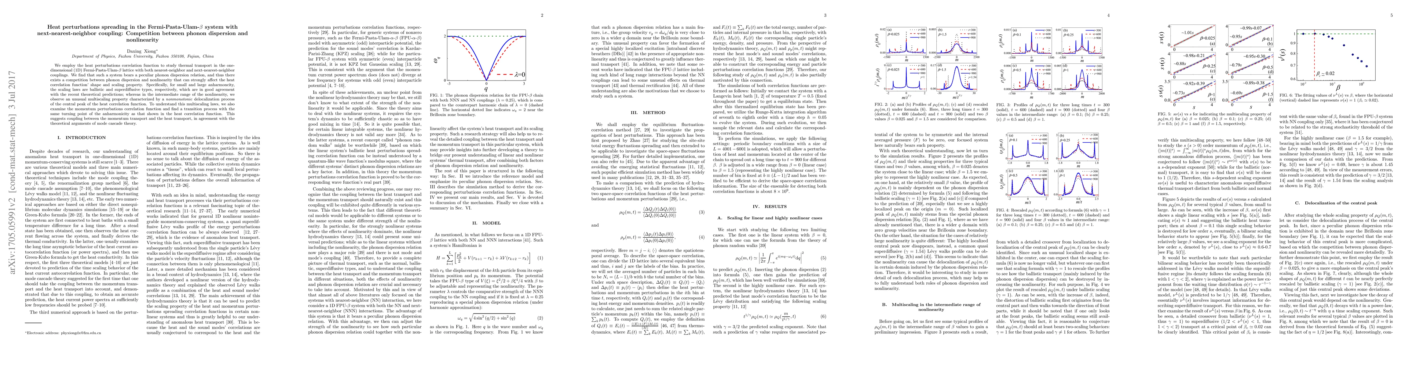 We employ the heat perturbations correlation function to study thermal transport in the one-dimensional (1D) Fermi-Pasta-Ulam-$\beta$ lattice with both nearest-neighbor and next-nearest-neighbor couplings. We find that such a system bears a peculiar phonon dispersion relation, and thus there exists a competition between phonon dispersion and nonlinearity that can strongly affect the heat correlation function' shape and scaling property. Specifically, for small and large anharmoncity, the scaling laws are ballistic and superdiffusive types, respectively, which are in good agreement with the recent theoretical predictions; whereas in the intermediate range of the nonlinearity, we observe an unusual multiscaling property characterized by a \emph{nonmonotonic} delocalization process of the central peak of the heat correlation function. To understand this multiscaling laws, we also examine the momentum perturbations correlation function and find a transition process with the same turning point of the anharmonicity as that shown in the heat correlation function. This suggests coupling between the momentum transport and the heat transport, in agreement with the theoretical arguments of mode cascade theory.