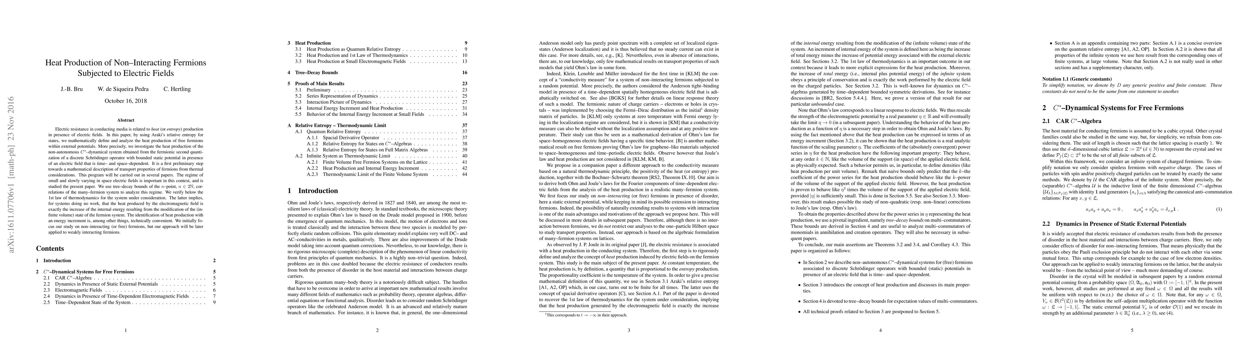 Electric resistance in conducting media is related to heat (or entropy) production in presence of electric fields. In this paper, by using Araki's relative entropy for states, we mathematically define and analyze the heat production of free fermions within external potentials. More precisely, we investigate the heat production of the non-autonomous C*-dynamical system obtained from the fermionic second quantization of a discrete Schr\"odinger operator with bounded static potential in presence of an electric field that is time- and space-dependent. It is a first preliminary step towards a mathematical description of transport properties of fermions from thermal considerations. This program will be carried out in several papers. The regime of small and slowly varying in space electric fields is important in this context, and is studied the present paper. We use tree-decay bounds of the $n$-point, $n\in 2\mathbb{N}$, correlations of the many-fermion system to analyze this regime. We verify below the 1st law of thermodynamics for the system under consideration. The latter implies, for systems doing no work, that the heat produced by the electromagnetic field is exactly the increase of the internal energy resulting from the modification of the (infinite volume) state of the fermion system. The identification of heat production with an energy increment is, among other things, technically convenient. We initially focus our study on non-interacting (or free) fermions, but our approach will be later applied to weakly interacting fermions.