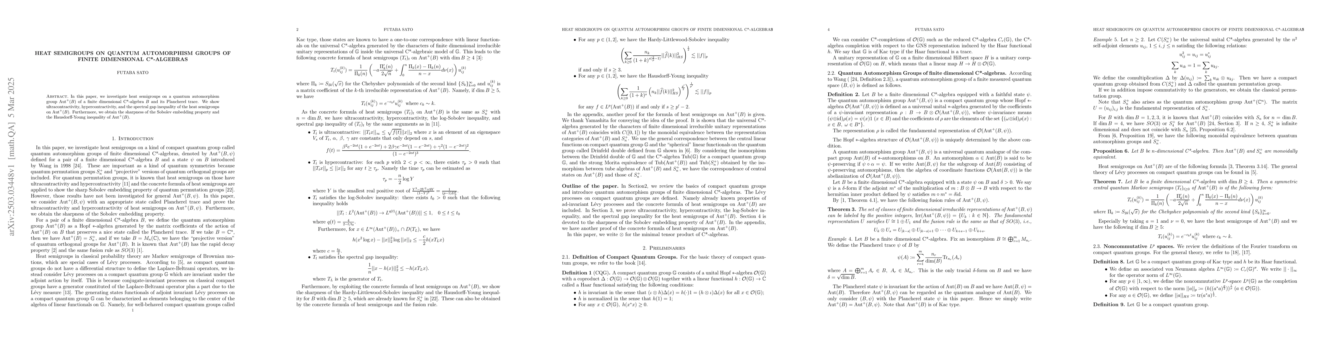 The research investigates heat semigroups on the quantum automorphism group ${\rm Aut}^+(B)$ of a finite dimensional C*-algebra $B$, examining their ultracontractivity, hypercontractivity, spectral gap inequality, and sharp Sobolev embedding and Hausdorff-Young inequalities.