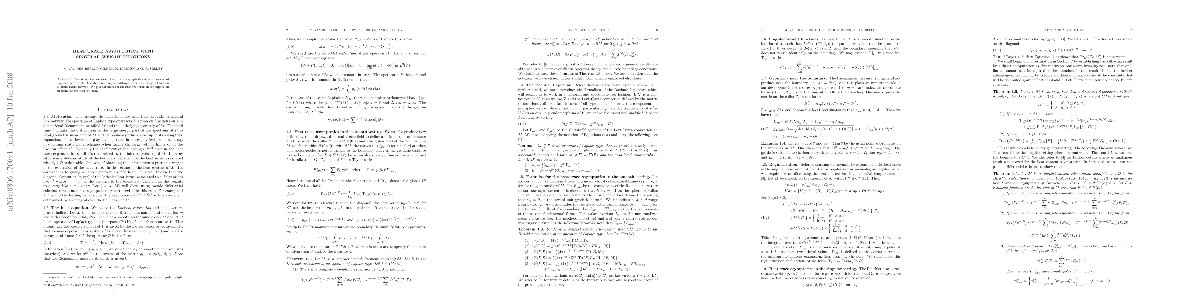 This paper explores the asymptotic behavior of the weighted heat trace for Laplace-type operators with singular weight functions that exhibit radial blowup, providing explicit formulas for the initial terms in the expansion based on geometrical data.