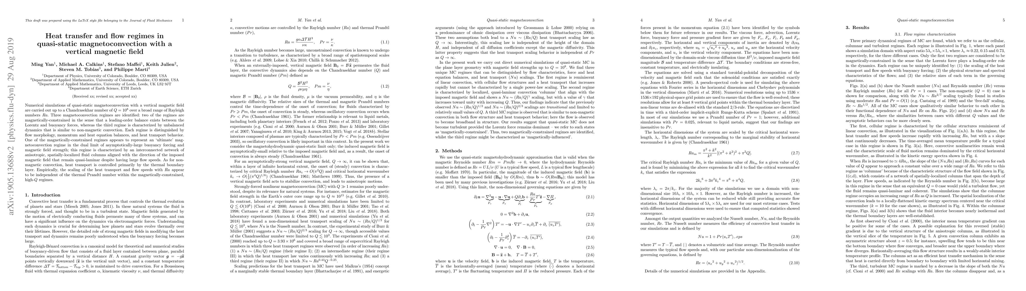 This paper investigates quasi-static magnetoconvection under a vertical magnetic field, identifying three distinct regimes based on force balances and flow morphology. The study reveals an "ultimate" regime with anisotropic, quasi-laminar fluid columns, and shows that heat transport scales independently of the thermal Prandtl number in high magnetic field strength scenarios.