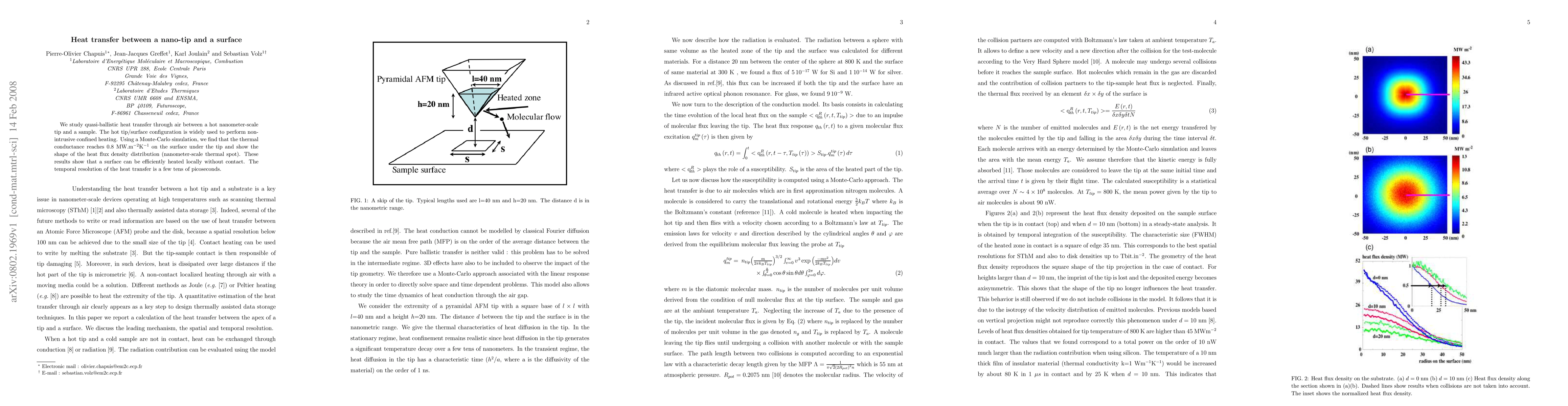 This study investigates quasi-ballistic heat transfer between a nanometer-scale hot tip and a surface using Monte-Carlo simulation, revealing a thermal conductance of 0.8 MW.m-2K-1 and demonstrating efficient localized heating without contact, with a temporal resolution of tens of picoseconds.