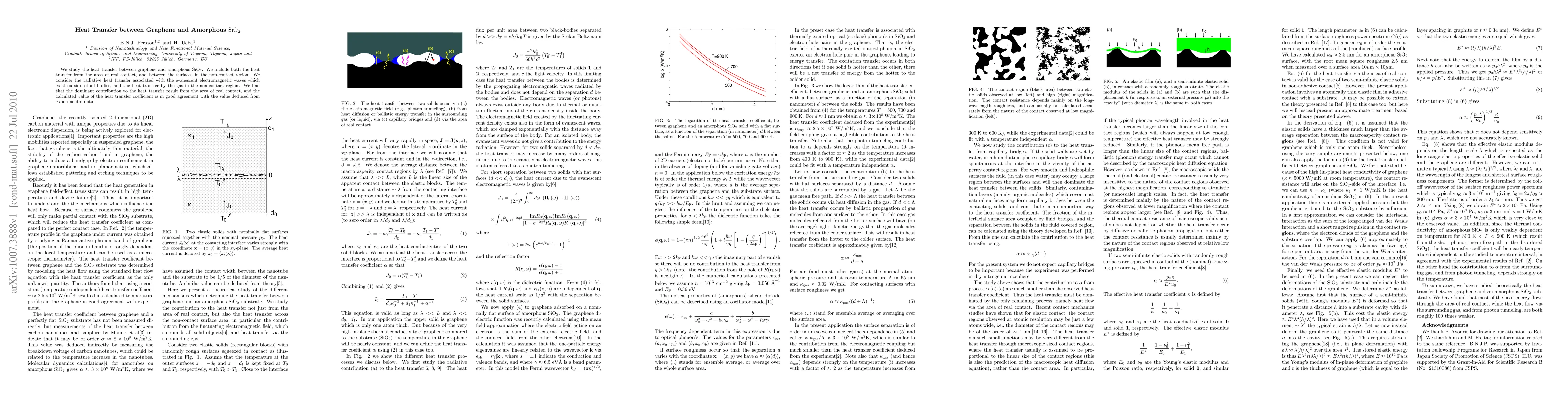 This study investigates heat transfer between graphene and amorphous SiO2, considering both contact and non-contact regions. The dominant heat transfer is found to occur at the area of real contact, with calculated heat transfer coefficients matching experimental data.