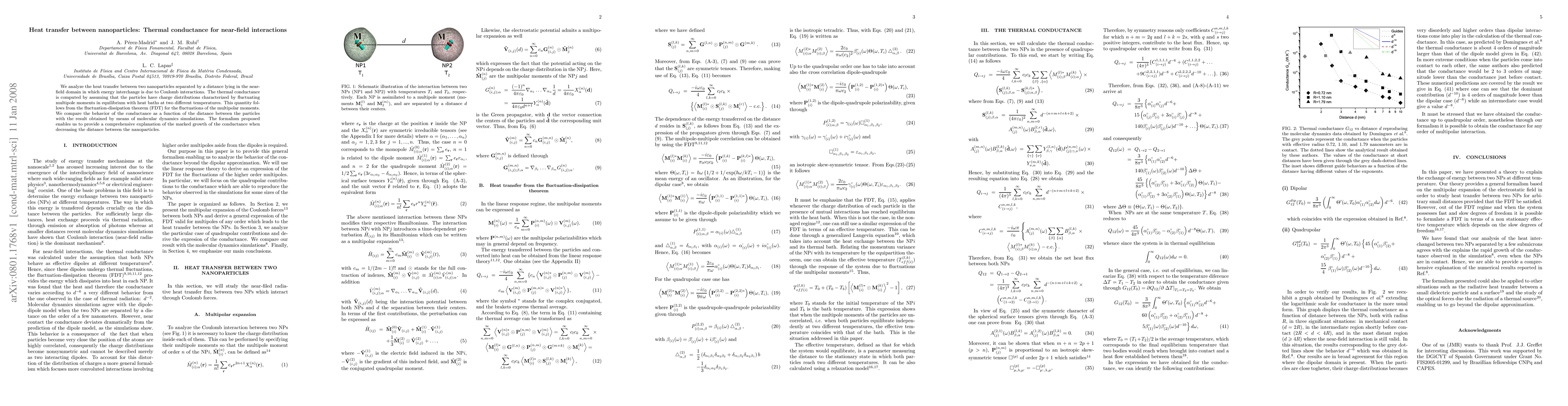 We analyze the heat transfer between two nanoparticles separated by a distance lying in the near-field domain in which energy interchange is due to Coulomb interactions. The thermal conductance is computed by assuming that the particles have charge distributions characterized by fluctuating multipole moments in equilibrium with heat baths at two different temperatures. This quantity follows from the fluctuation-dissipation theorem (FDT) for the fluctuations of the multipolar moments. We compare the behavior of the conductance as a function of the distance between the particles with the result obtained by means of molecular dynamics simulations. The formalism proposed enables us to provide a comprehensive explanation of the marked growth of the conductance when decreasing the distance between the nanoparticles.