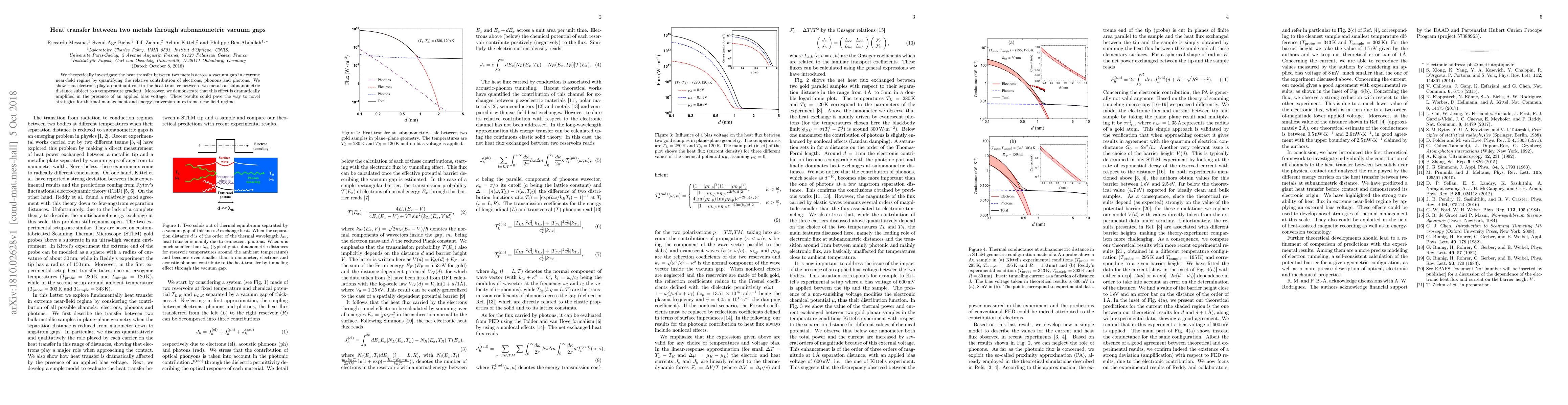 This paper investigates heat transfer between two metals separated by a subnanometric vacuum gap, revealing that electrons dominate heat transfer due to their significant contribution in the near-field regime. The study also shows that an applied bias voltage greatly enhances this electron-mediated heat transfer, potentially leading to new thermal management techniques.