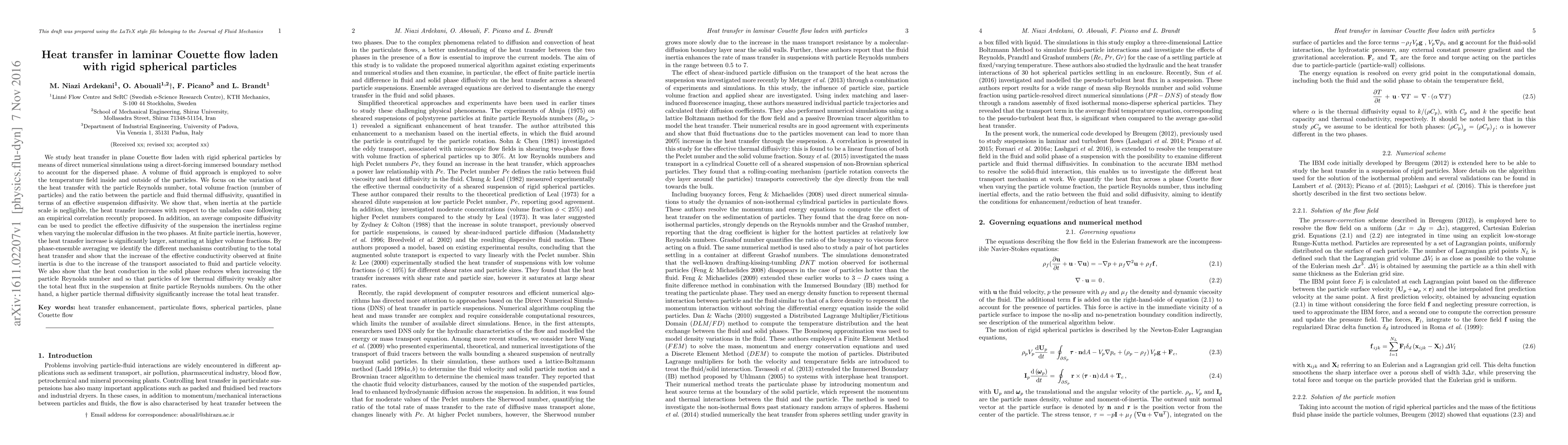 This paper investigates heat transfer in laminar Couette flow with rigid spherical particles using direct numerical simulations. It finds that heat transfer increases with particle volume fraction and thermal diffusivity, especially at finite particle inertia, due to enhanced transport from fluid and particle velocities.