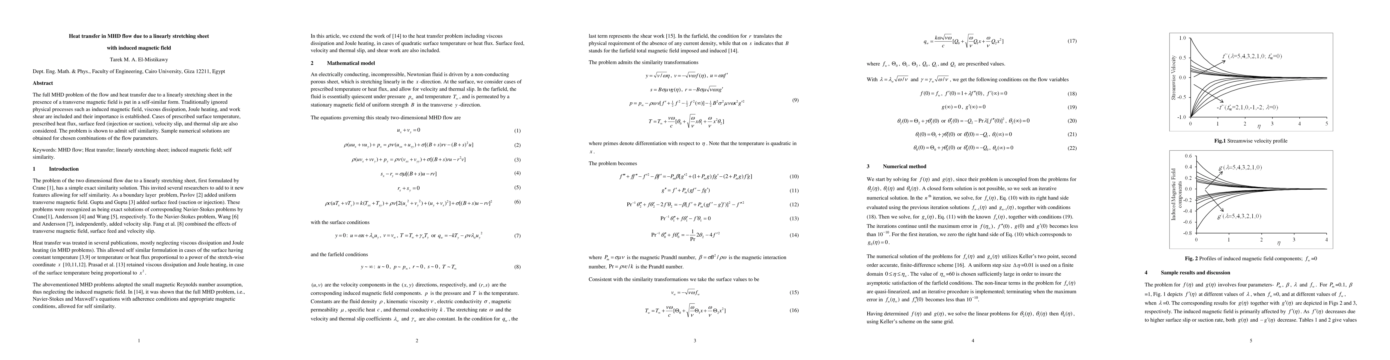The full MHD problem of the flow and heat transfer due to a linearly stretching sheet in the presence of a transverse magnetic field is put in a self-similar form. Traditionally ignored physical processes such as induced magnetic field, viscous dissipation, Joule heating, and work shear are included and their importance is established. Cases of prescribed surface temperature, prescribed heat flux, surface feed (injection or suction), velocity slip, and thermal slip are also considered. The problem is shown to admit self similarity. Sample numerical solutions are obtained for chosen combinations of the flow parameters.
