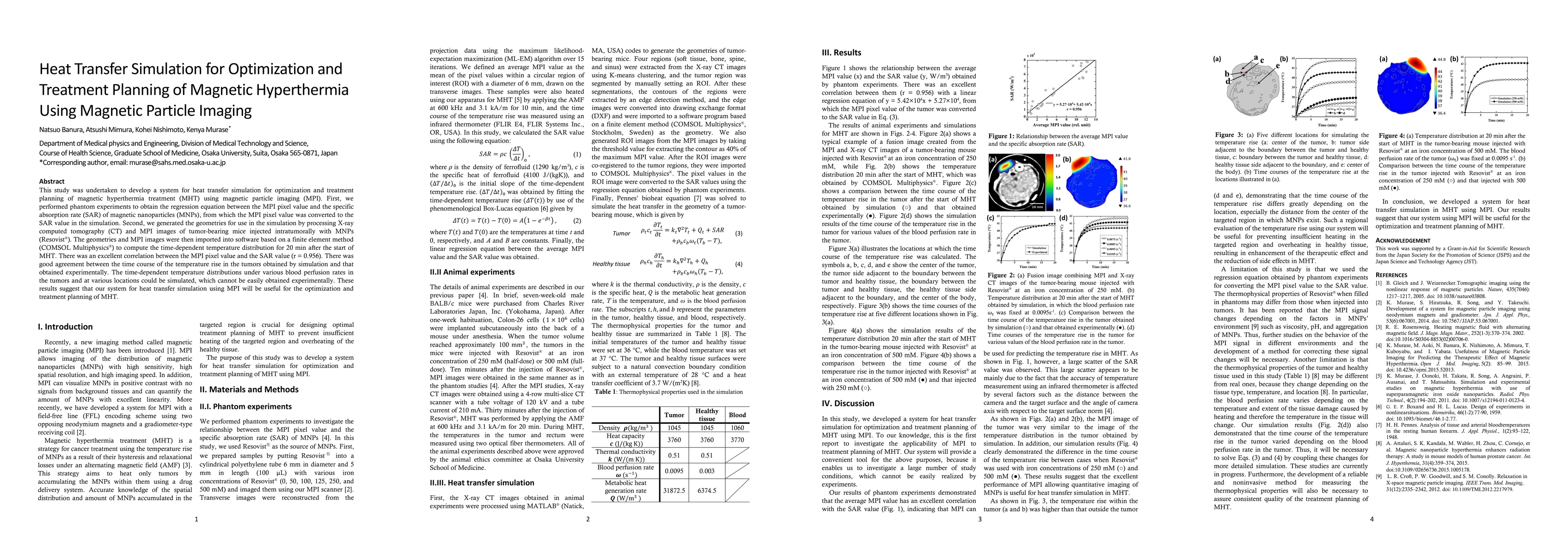 This study developed a heat transfer simulation system for optimizing magnetic hyperthermia treatment using magnetic particle imaging, showing excellent correlation between MPI pixel values and specific absorption rates, and validating the simulation's accuracy through experimental comparisons. The simulation enables detailed modeling of temperature distributions under various conditions, aiding in treatment planning.