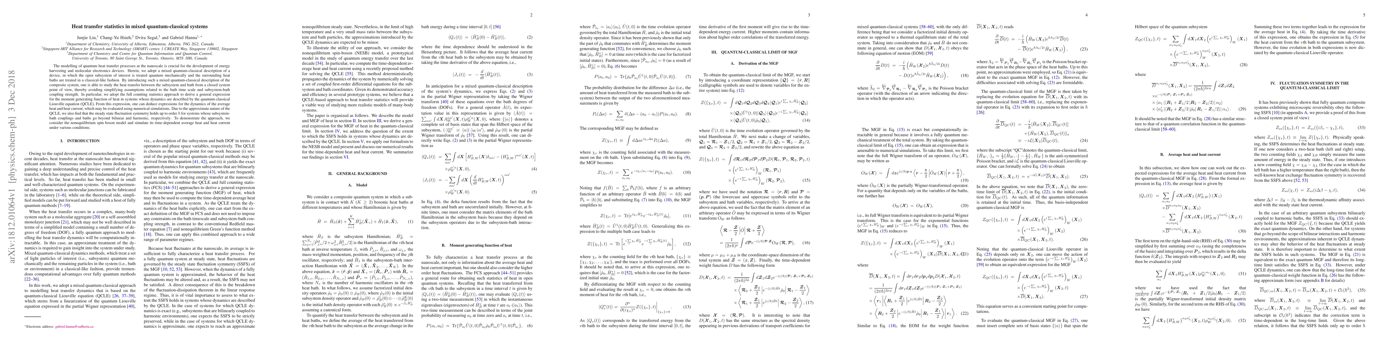 This paper develops a mixed quantum-classical model to study quantum heat transfer at the nanoscale, using the quantum-classical Liouville equation and full counting statistics. It derives expressions for the moment generating function of heat and demonstrates the approach through simulations of the nonequilibrium spin boson model.