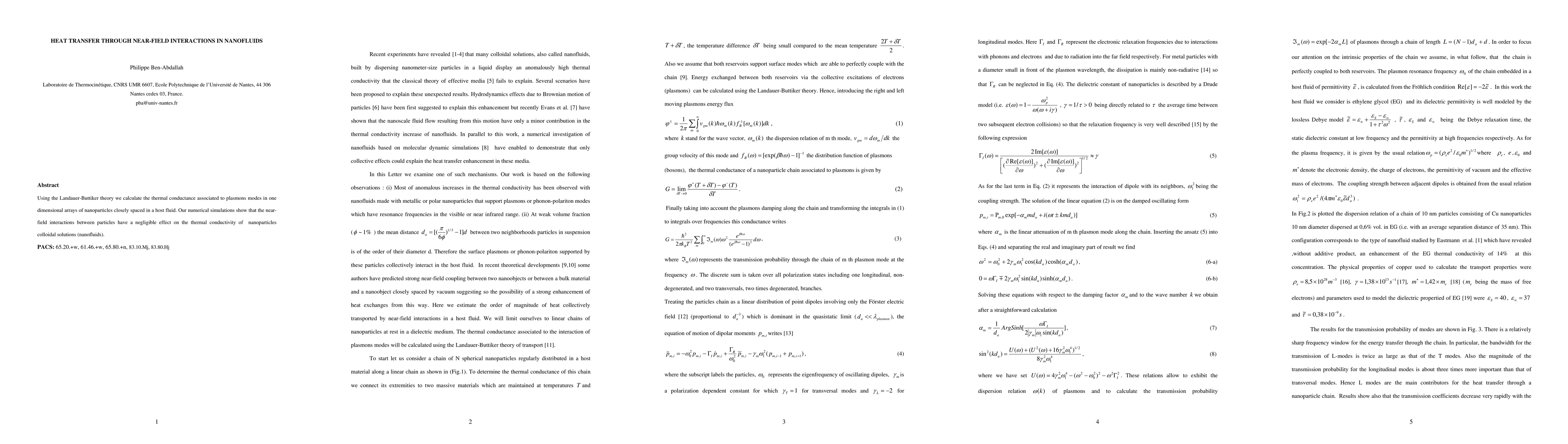 Using the Landauer-Buttiker theory we calculate the thermal conductance associated to plasmons modes in one dimensional arrays of nanoparticles closely spaced in a host fluid. Our numerical simulations show that the near-field interactions between particles have a negligible effect on the thermal conductivity of nanoparticles colloidal solutions (nanofluids).
