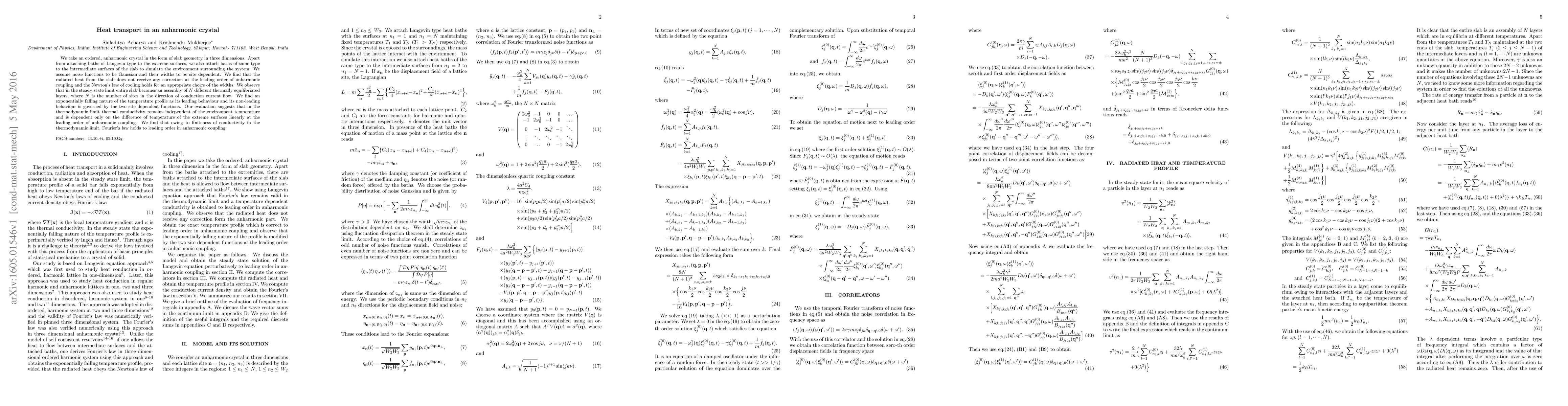 We take an ordered, anharmonic crystal in the form of slab geometry in three dimensions. Apart from attaching baths of Langevin type to the extreme surfaces, we also attach baths of same type to the intermediate surfaces of the slab to simulate the environment surrounding the system. We assume noise functions to be Gaussian and their widths to be site dependent. We find that the radiated heat from the slab does not receive any correction at the leading order of anharmonic coupling and the Newton's law of cooling holds for an appropriate choice of the widths. We observe that in the steady state limit entire slab becomes an assembly of $N$ different thermally equilibriated layers, where $N$ is the number of sites in the direction of conduction current flow. We find an exponentially falling nature of the temperature profile as its leading behaviour and its non-leading behaviour is governed by the two site dependent functions. Our evaluation suggests that in the thermodynamic limit thermal conductivity remains independent of the environment temperature and is dependent only on the difference of temperature of the extreme surfaces linearly at the leading order of anharmonic coupling. We find that owing to finiteness of conductivity in the thermodynamic limit, Fourier's law holds to leading order in anharmonic coupling.