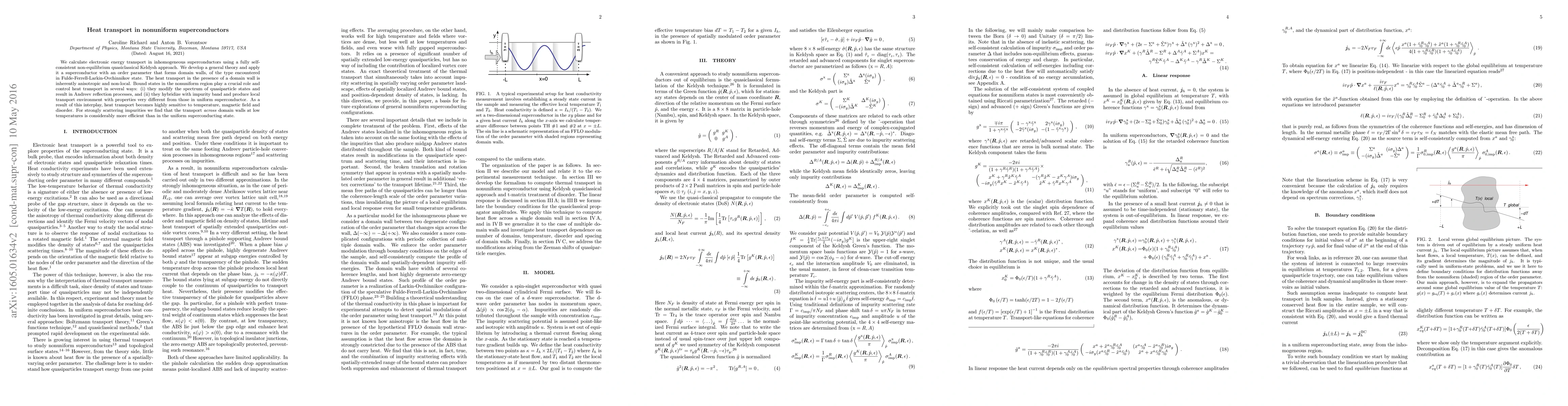 We calculate electronic energy transport in inhomogeneous superconductors using a fully self-consistent non-equilibrium quasiclassical Keldysh approach. We develop a general theory and apply it a superconductor with an order parameter that forms domain walls, of the type encountered in Fulde-Ferrell-Larkin-Ovchinnikov state. The heat transport in the presence of a domain wall is inherently anisotropic and non-local. Bound states in the nonuniform region play a crucial role and control heat transport in several ways: (i) they modify the spectrum of quasiparticle states and result in Andreev reflection processes, and (ii) they hybridize with impurity band and produce local transport environment with properties very different from those in uniform superconductor. As a result of this interplay, heat transport becomes highly sensitive to temperature, magnetic field and disorder. For strongly scattering impurities we find that the transport across domain walls at low temperatures is considerably more efficient than in the uniform superconducting state.