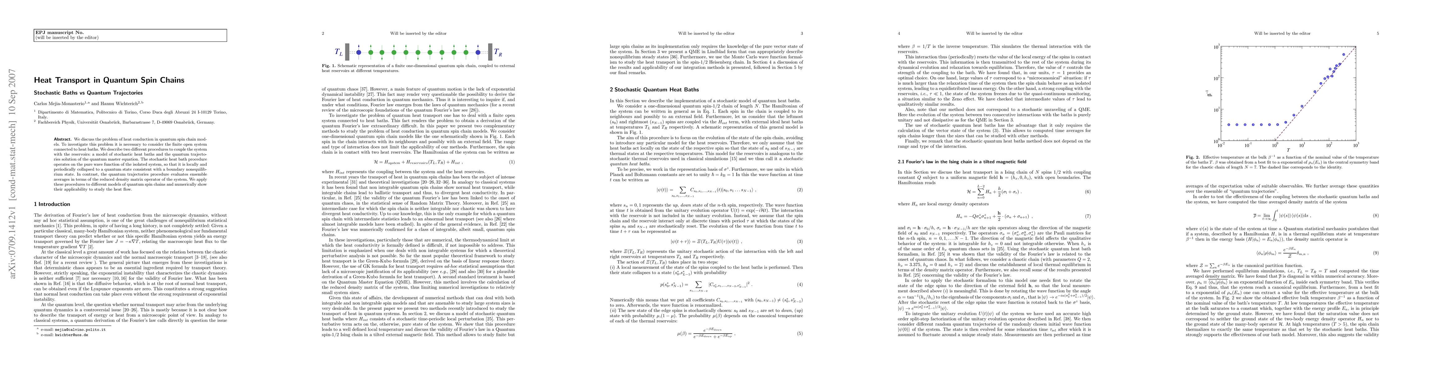 This paper investigates heat transport in quantum spin chains using two methods: stochastic heat baths and quantum trajectories. The former collapses the system's wave function periodically to match boundary conditions, while the latter computes ensemble averages via the reduced density matrix. Both methods are applied to various quantum spin chain models to study heat flow.