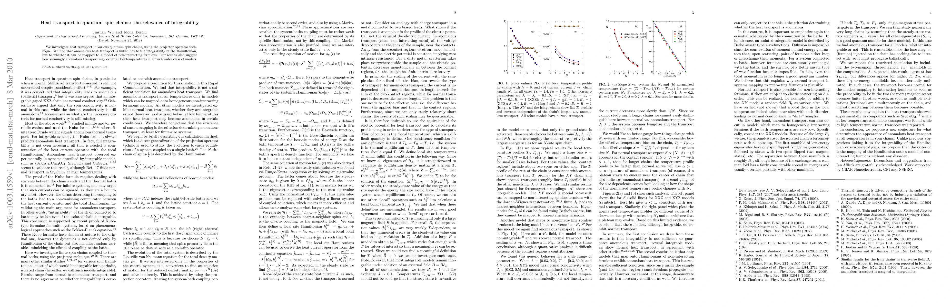 We investigate heat transport in various quantum spin chains, using the projector operator technique. We find that anomalous heat transport is linked not to the integrability of the Hamiltonian, but to whether it can be mapped to a model of non-interacting fermions. Our results also suggest how seemingly anomalous transport may occur at low temperatures in a much wider class of models.