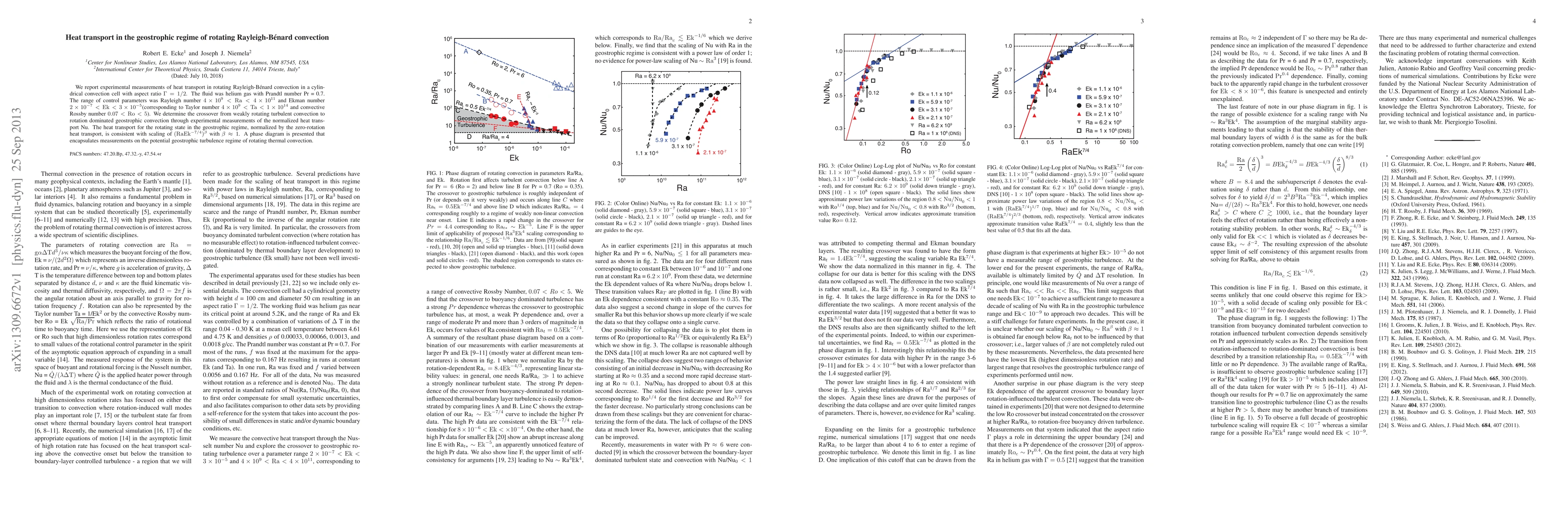 This paper reports experimental measurements of heat transport in rotating Rayleigh-Bénard convection, identifying the transition from turbulent to geostrophic convection. The study finds that heat transport scales as $({\rm RaEk}^{-7/4})^\beta$ with $\beta \approx 1$ in the geostrophic regime.