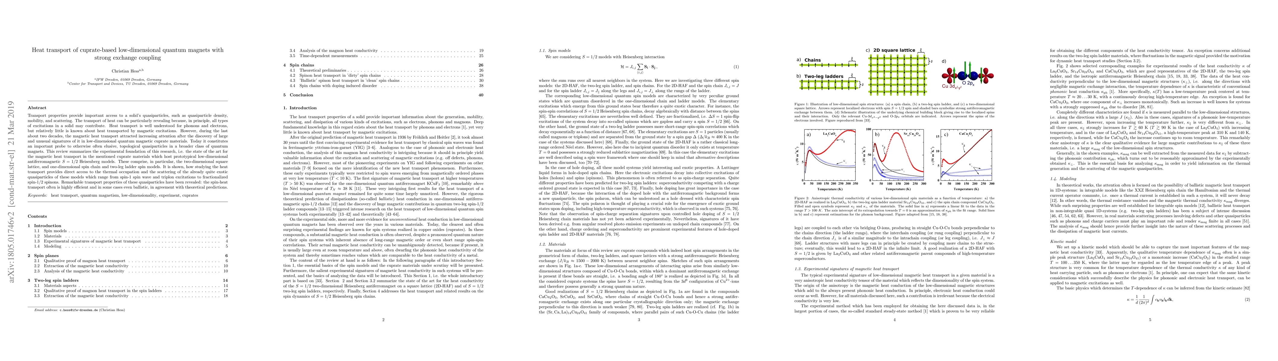 This paper reviews the experimental findings on heat transport in low-dimensional quantum magnetic cuprate materials, highlighting the efficient and sometimes ballistic transport of magnetic excitations such as spin waves, triplons, and spinons, providing insights into their thermal occupation and scattering.