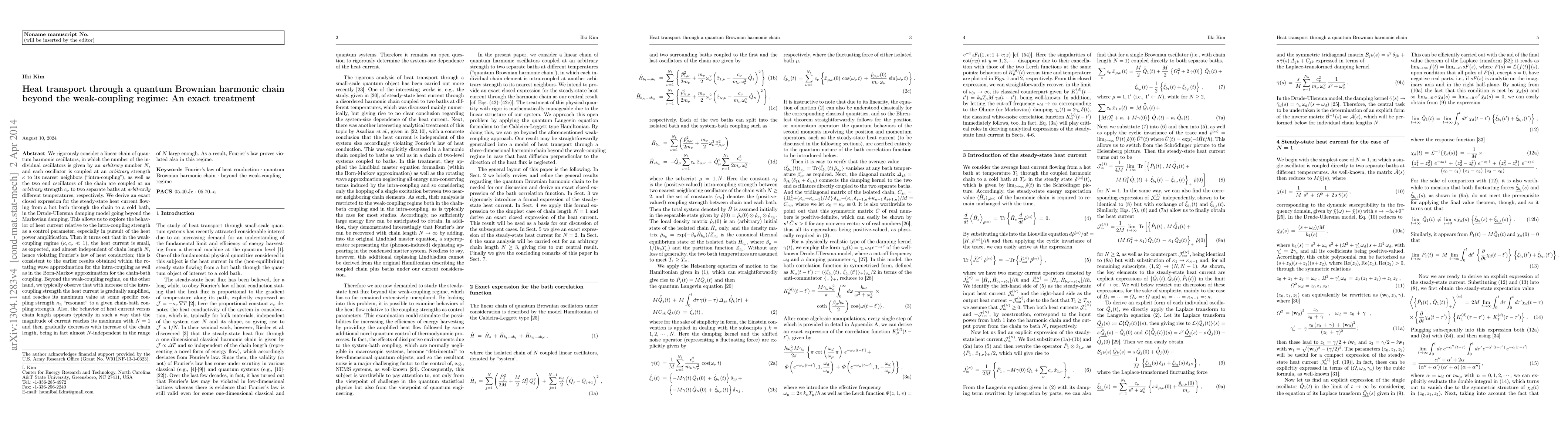 We consider a linear chain of quantum harmonic oscillators, in which the number of the individual oscillators is given by an arbitrary number N, and each oscillator is coupled at an arbitrary strength kappa to its nearest neighbors ("intra-coupling"), as well as the two end oscillators of the chain are coupled at an arbitrary strength c_nu to two separate baths at arbitrarily different temperatures, respectively. We derive an exact closed expression for the steady-state heat current flowing from a hot bath through the chain to a cold bath, in the Drude-Ullersma damping model going beyond the Markovian damping. This allows us to explore the behavior of heat current relative to the intra-coupling strength as a control parameter, especially in pursuit of the heat power amplification. Then it turns out that in the weak-coupling regime (kappa, c_nu << 1), the heat current is small, as expected, and almost independent of chain length N, hence violating Fourier's law of heat conduction; this is consistent to the earlier results obtained within the rotating wave approximation for the intra-coupling as well as in the Born-Markov approximation for the chain-bath coupling. Beyond the weak-coupling regime, on the other hand, we typically observe that with increase of the intra-coupling strength the heat current is gradually amplified, and reaches its maximum value at some specific coupling strength kappa_R "resonant" to a given chain-bath coupling strength. Also, the behavior of heat current versus chain length appears typically in such a way that the magnitude of current reaches its maximum with N=1 and then gradually decreases with increase of the chain length, being in fact almost N-independent in the range of N large enough. As a result, Fourier's law proves violated also in this regime.