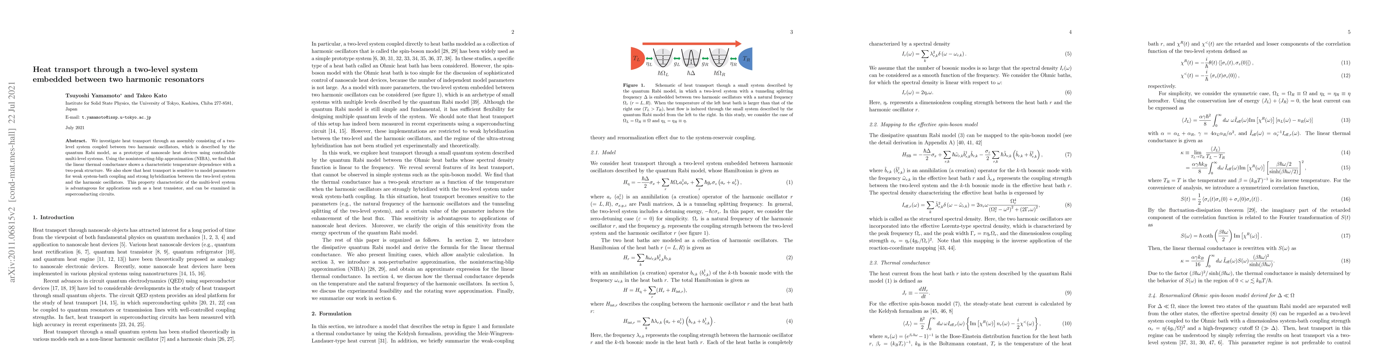 We investigate heat transport through an assembly consisting of a two-level system coupled between two harmonic oscillators, which is described by the quantum Rabi model, as a prototype of nanoscale heat devices using controllable multi-level systems. Using the noninteracting-blip approximation (NIBA), we find that the linear thermal conductance shows a characteristic temperature dependence with a two-peak structure. We also show that heat transport is sensitive to model parameters for weak system-bath coupling and strong hybridization between the two-level system and the harmonic oscillators. This property characteristic of the multi-level system is advantageous for applications such as a heat transistor, and can be examined in superconducting circuits.