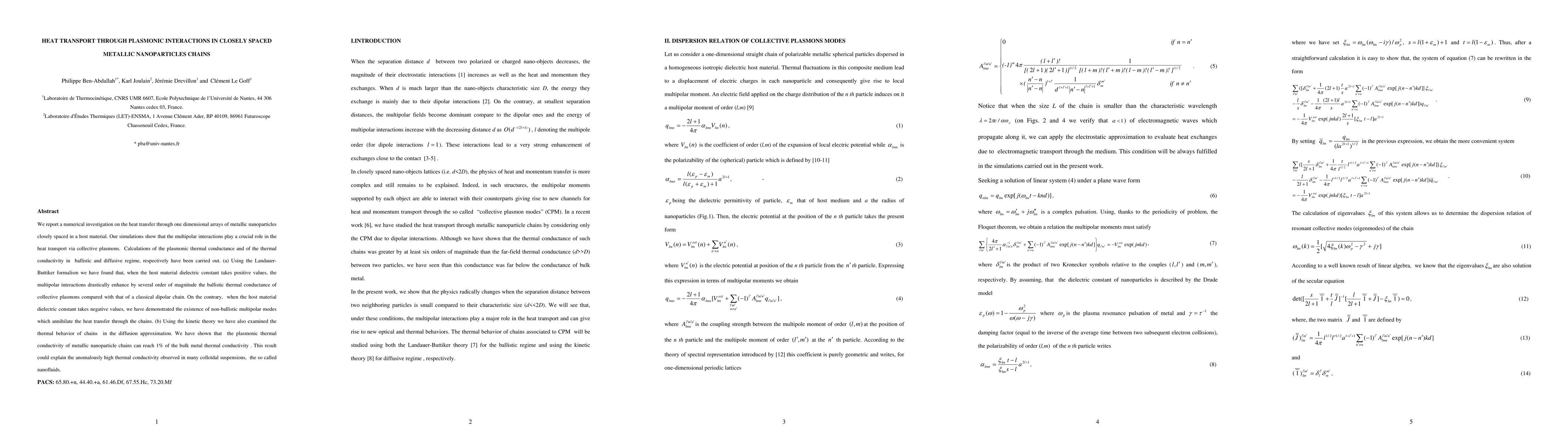This paper investigates heat transfer in closely spaced metallic nanoparticle chains using numerical simulations. It finds that multipolar interactions significantly enhance ballistic thermal conductance via collective plasmons, while non-ballistic modes can inhibit heat transfer when the host material's dielectric constant is negative. Additionally, the plasmonic thermal conductivity in diffusive regimes can reach 1% of bulk metal conductivity, potentially explaining the high thermal conductivity in nanofluids.