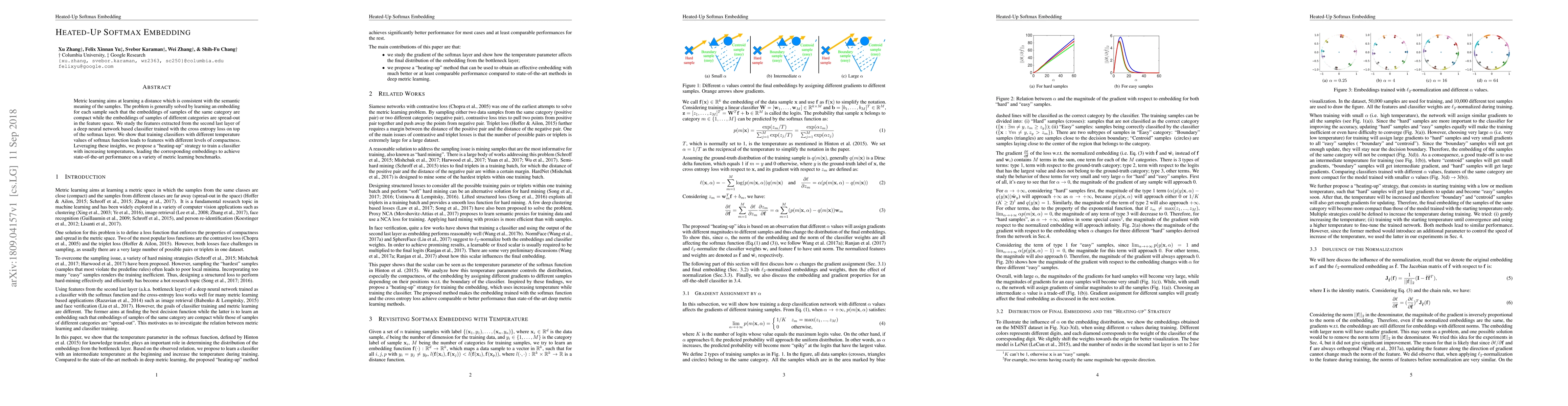 Metric learning aims at learning a distance which is consistent with the semantic meaning of the samples. The problem is generally solved by learning an embedding for each sample such that the embeddings of samples of the same category are compact while the embeddings of samples of different categories are spread-out in the feature space. We study the features extracted from the second last layer of a deep neural network based classifier trained with the cross entropy loss on top of the softmax layer. We show that training classifiers with different temperature values of softmax function leads to features with different levels of compactness. Leveraging these insights, we propose a "heating-up" strategy to train a classifier with increasing temperatures, leading the corresponding embeddings to achieve state-of-the-art performance on a variety of metric learning benchmarks.