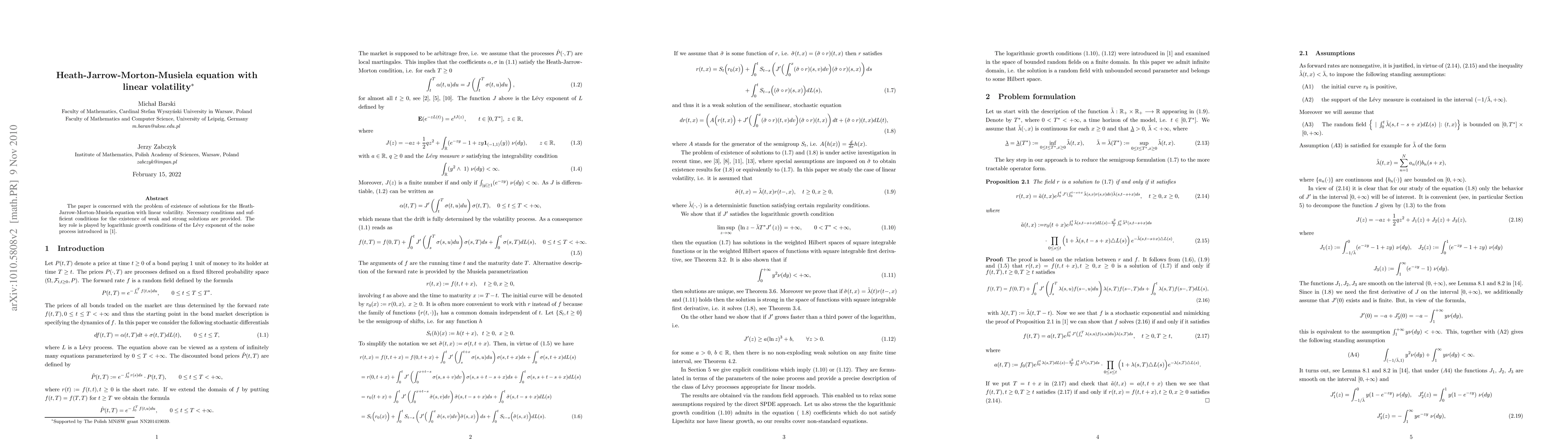 Summary: This paper investigates the existence of solutions for the Heath-Jarrow-Morton equation with linear volatility, providing necessary and sufficient conditions for both weak and strong solutions, with a focus on the importance of logarithmic growth conditions of the Laplace exponent.