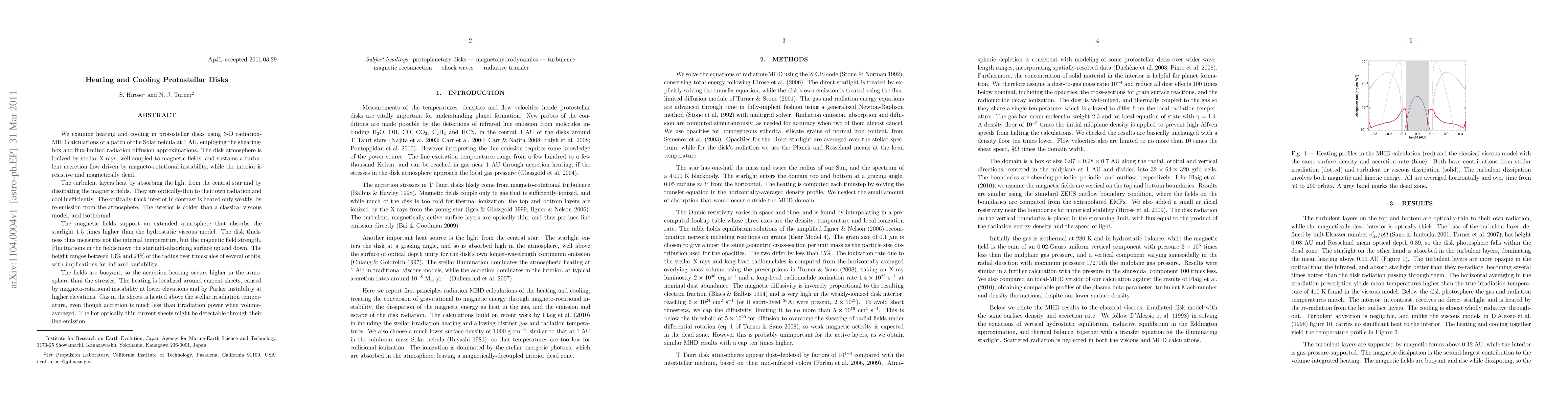 We examine heating and cooling in protostellar disks using 3-D radiation-MHD calculations of a patch of the Solar nebula at 1 AU, employing the shearing-box and flux-limited radiation diffusion approximations. The disk atmosphere is ionized by stellar X-rays, well-coupled to magnetic fields, and sustains a turbulent accretion flow driven by magneto-rotational instability, while the interior is resistive and magnetically dead. The turbulent layers heat by absorbing the light from the central star and by dissipating the magnetic fields. They are optically-thin to their own radiation and cool inefficiently. The optically-thick interior in contrast is heated only weakly, by re-emission from the atmosphere. The interior is colder than a classical viscous model, and isothermal. The magnetic fields support an extended atmosphere that absorbs the starlight 1.5 times higher than the hydrostatic viscous model. The disk thickness thus measures not the internal temperature, but the magnetic field strength. Fluctuations in the fields move the starlight-absorbing surface up and down. The height ranges between 13% and 24% of the radius over timescales of several orbits, with implications for infrared variability. The fields are buoyant, so the accretion heating occurs higher in the atmosphere than the stresses. The heating is localized around current sheets, caused by magneto-rotational instability at lower elevations and by Parker instability at higher elevations. Gas in the sheets is heated above the stellar irradiation temperature, even though accretion is much less than irradiation power when volume-averaged. The hot optically-thin current sheets might be detectable through their line emission.