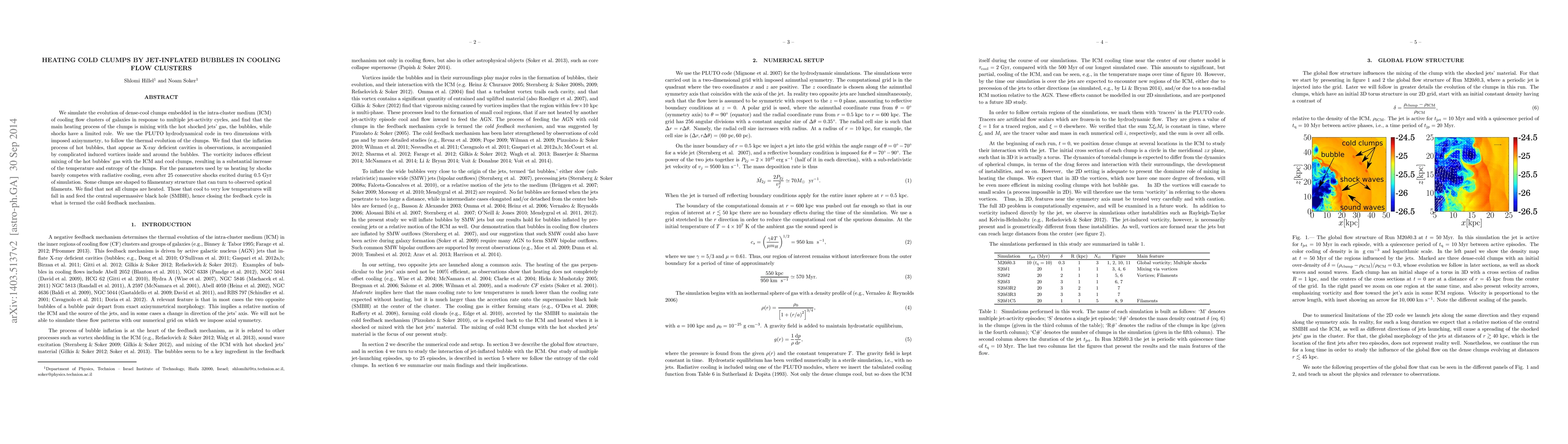 We simulate the evolution of dense-cool clumps embedded in the intra-cluster medium (ICM) of cooling flow clusters of galaxies in response to multiple jet-activity cycles, and find that the main heating process of the clumps is mixing with the hot shocked jets' gas, the bubbles, while shocks have a limited role. We use the PLUTO hydrodynamical code in two dimensions with imposed axisymmetry, to follow the thermal evolution of the clumps. We find that the inflation process of hot bubbles, that appear as X-ray deficient cavities in observations, is accompanied by complicated induced vortices inside and around the bubbles. The vorticity induces efficient mixing of the hot bubbles' gas with the ICM and cool clumps, resulting in a substantial increase of the temperature and entropy of the clumps. For the parameters used by us heating by shocks barely competes with radiative cooling, even after 25 consecutive shocks excited during 0.5 Gyr of simulation. Some clumps are shaped to filamentary structure that can turn to observed optical filaments. We find that not all clumps are heated. Those that cool to very low temperatures will fall in and feed the central supermassive black hole (SMBH), hence closing the feedback cycle in what is termed the cold feedback mechanism.