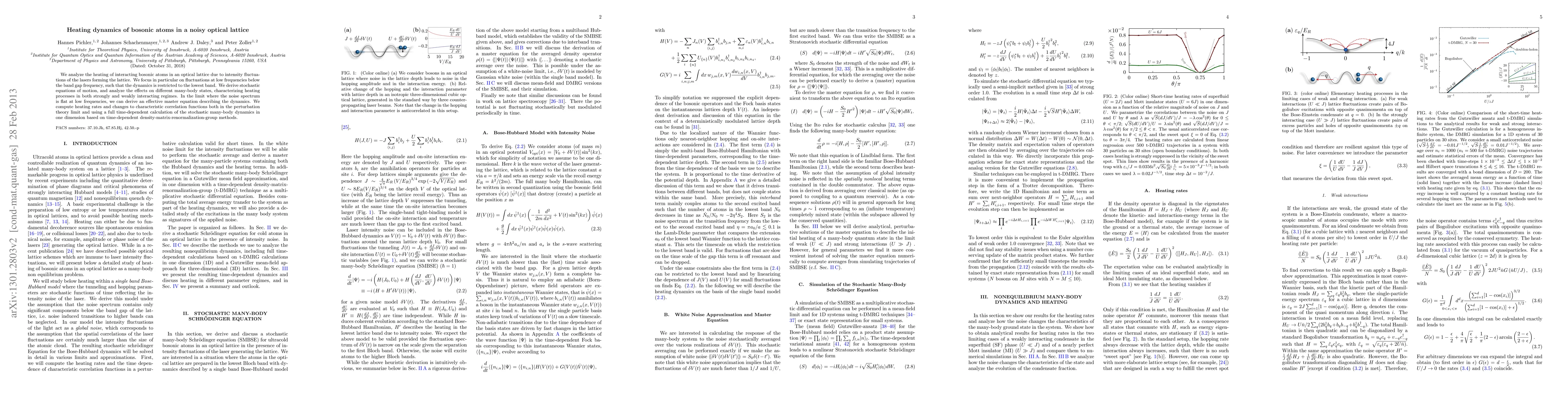 This paper investigates the heating dynamics of bosonic atoms in an optical lattice caused by low-frequency laser intensity fluctuations, deriving stochastic equations of motion and analyzing the effects on various many-body states. It computes heating rates and changes in correlation functions using both perturbation theory and time-dependent density-matrix-renormalization-group methods.