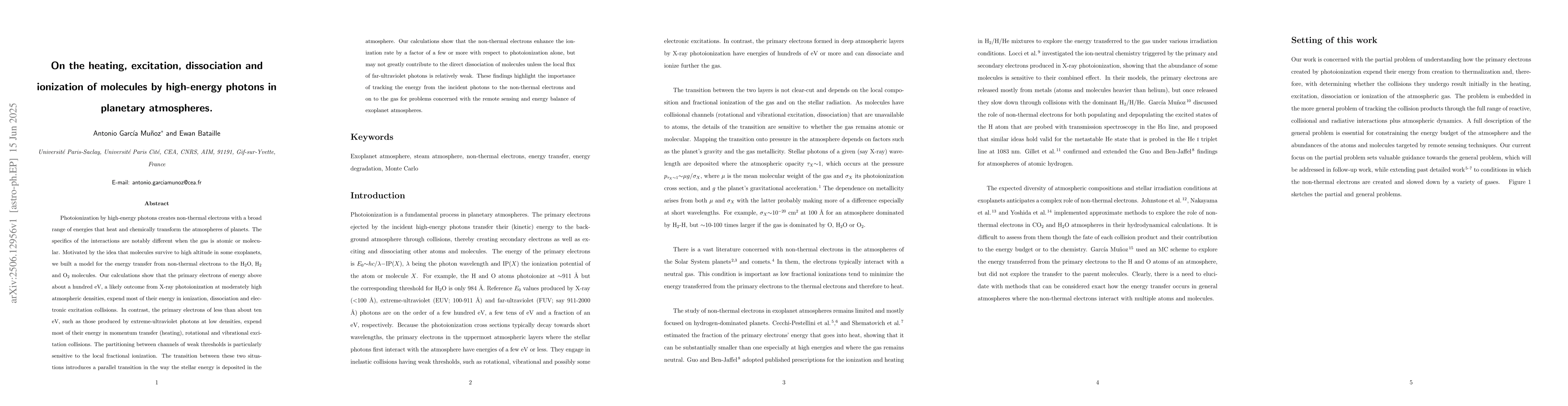 This work introduces a comprehensive model that captures the complex energy transfer processes from high-energy photons to molecules in planetary atmospheres, offering insights into heating, excitation, dissociation, and ionization, which are critical for understanding exoplanet atmospheres.