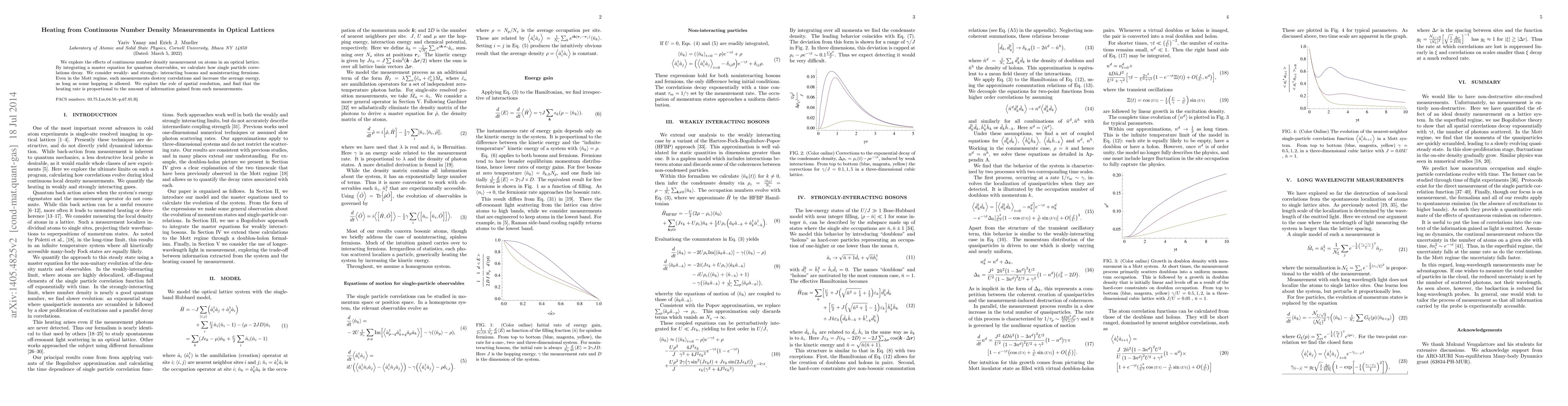 We explore the effects of continuous number density measurement on atoms in an optical lattice. By integrating a master equation for quantum observables, we calculate how single particle correlations decay. We consider weakly- and strongly- interacting bosons and noninteracting fermions. Even in the Mott regime, such measurements destroy correlations and increase the average energy, as long as some hopping is allowed. We explore the role of spatial resolution, and find that the heating rate is proportional to the amount of information gained from such measurements.