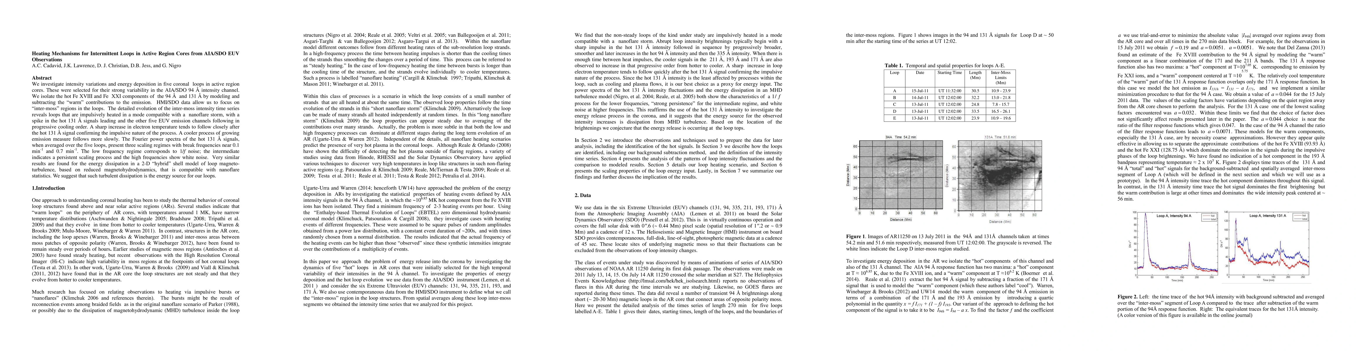 We investigate intensity variations and energy deposition in five coronal loops in active region cores. These were selected for their strong variability in the AIA/SDO 94 {\AA} intensity channel. We isolate the hot Fe XVIII and Fe XXI components of the 94 {\AA} and 131 {\AA} by modeling and subtracting the "warm" contributions to the emission. HMI/SDO data allow us to concentrate on "inter-moss" regions in the loops. The detailed evolution of the inter-moss intensity time series reveals loops that are impulsively heated in a mode compatible with a nanoflare storm, with a spike in the hot 131 {\AA} signals leading and the other five EUV emission channels following in progressive cooling order. A sharp increase in electron temperature tends to follow closely after the hot 131 {\AA} signal confirming the impulsive nature of the process. A cooler process of growing emission measure follows more slowly. The Fourier power spectra of the hot 131 {\AA} signals, when averaged over the five loops, present three scaling regimes with break frequencies at (0.1/min) and (0.7/min). The low frequency regime corresponds to 1/f noise; the intermediate indicates a persistent scaling process and the high frequencies show white noise. Very similar results are found for the energy dissipation in a 2-D "hybrid" shell model of loop magneto-turbulence, based on reduced magnetohydrodynamics, which is compatible with nanoflare statistics. We suggest that such turbulent dissipation is the energy source for our loops.