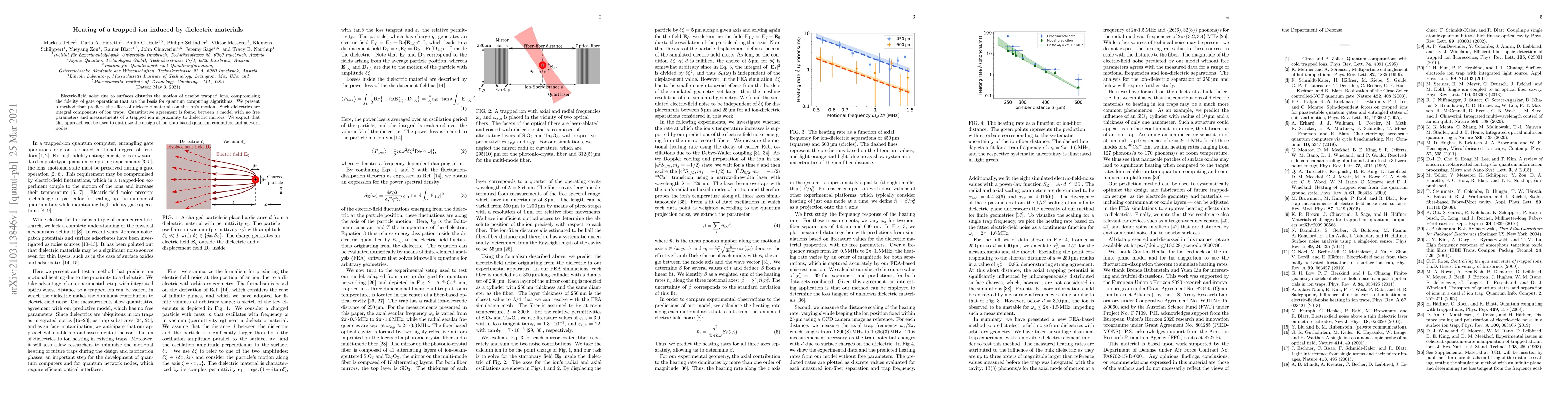 Electric-field noise due to surfaces disturbs the motion of nearby trapped ions, compromising the fidelity of gate operations that are the basis for quantum computing algorithms. We present a method that predicts the effect of dielectric materials on the ion's motion. Such dielectrics are integral components of ion traps. Quantitative agreement is found between a model with no free parameters and measurements of a trapped ion in proximity to dielectric mirrors. We expect that this approach can be used to optimize the design of ion-trap-based quantum computers and network nodes.