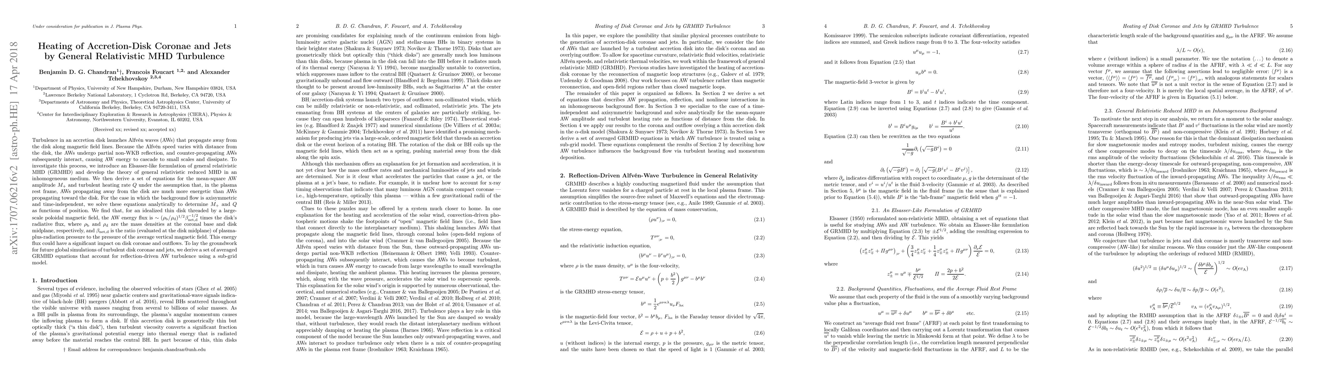 The paper introduces an Elsasser-like formulation of GRMHD and develops the theory of GR reduced MHD in an inhomogeneous medium, deriving equations for mean-square AW amplitude and turbulent heating rate.