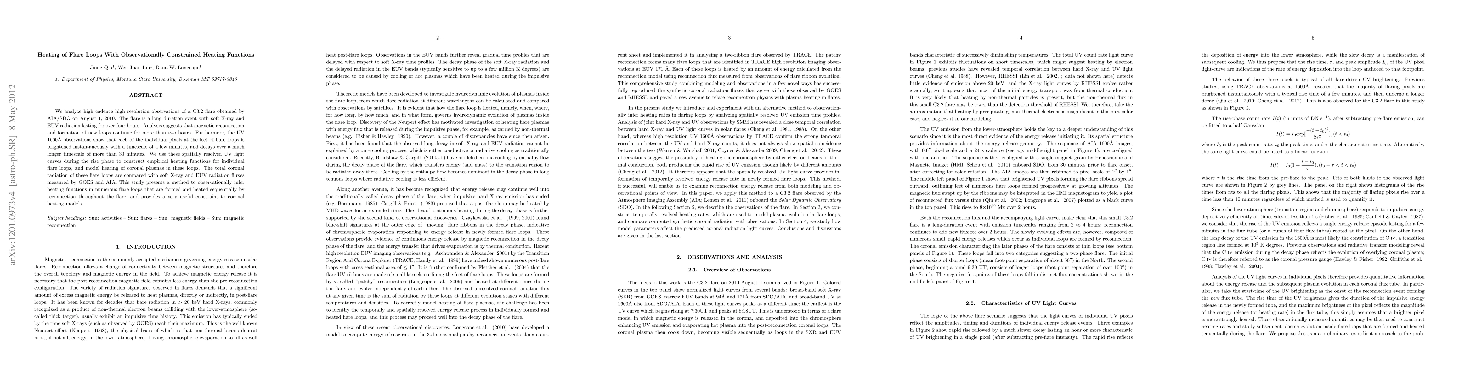 We analyze high cadence high resolution observations of a C3.2 flare obtained by AIA/SDO on August 1, 2010. The flare is a long duration event with soft X-ray and EUV radiation lasting for over four hours. Analysis suggests that magnetic reconnection and formation of new loops continue for more than two hours. Furthermore, the UV 1600\AA\ observations show that each of the individual pixels at the feet of flare loops is brightened instantaneously with a timescale of a few minutes, and decays over a much longer timescale of more than 30 minutes. We use these spatially resolved UV light curves during the rise phase to construct empirical heating functions for individual flare loops, and model heating of coronal plasmas in these loops. The total coronal radiation of these flare loops are compared with soft X-ray and EUV radiation fluxes measured by GOES and AIA. This study presents a method to observationally infer heating functions in numerous flare loops that are formed and heated sequentially by reconnection throughout the flare, and provides a very useful constraint to coronal heating models.
