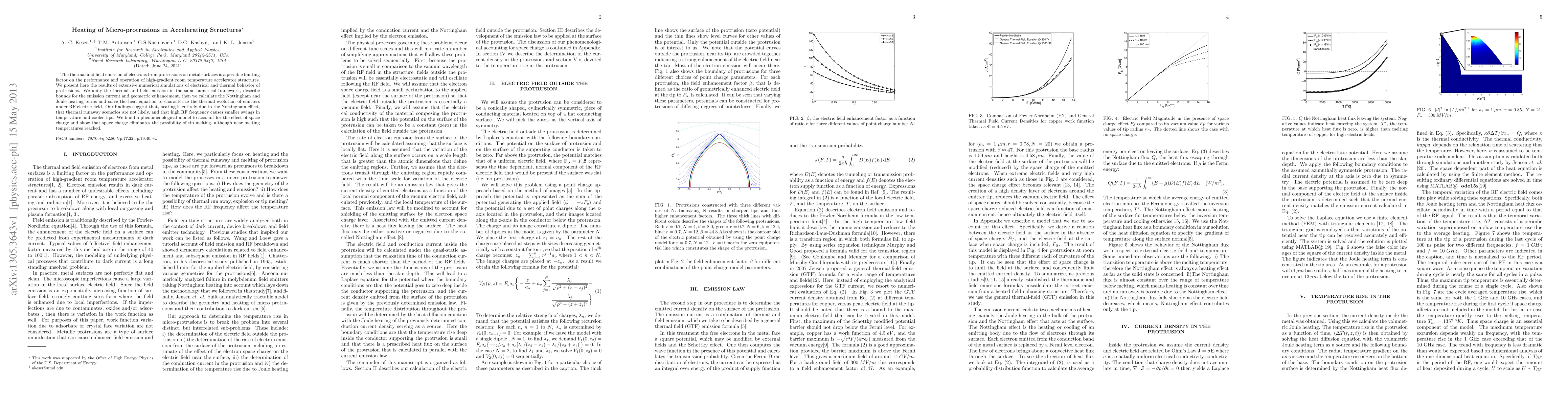 This paper presents numerical simulations of the thermal and field emission behavior of protrusions on metal surfaces in high-gradient accelerator structures. The study finds that heating is primarily due to the Nottingham effect, and high RF frequencies lead to cooler tips, while space charge prevents tip melting.