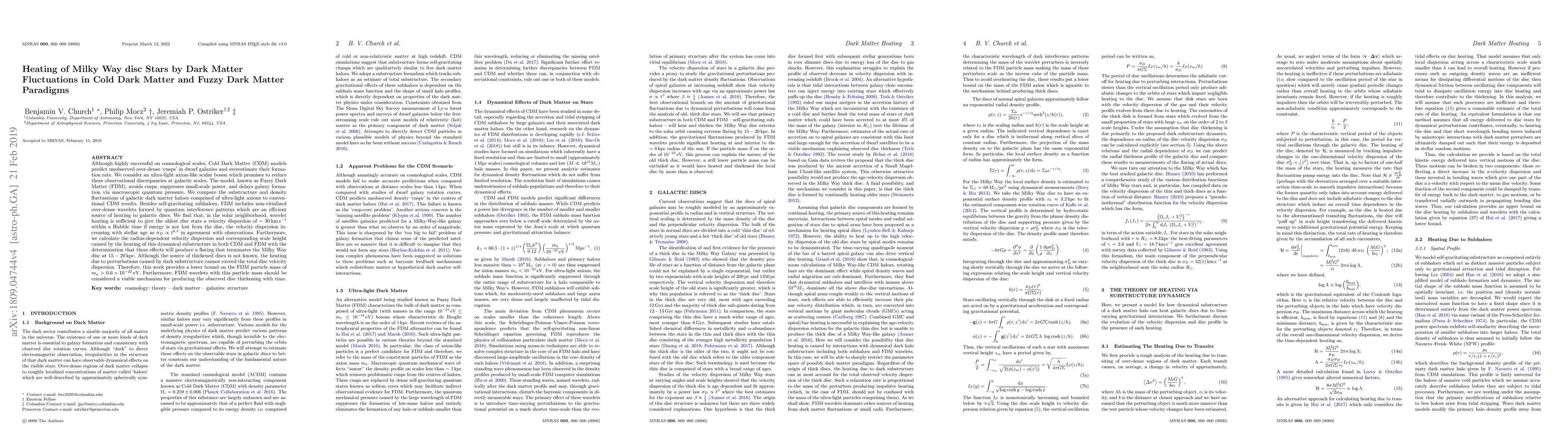 Although highly successful on cosmological scales, Cold Dark Matter (CDM) models predict unobserved over-dense `cusps' in dwarf galaxies and overestimate their formation rate. We consider an ultra-light axion-like scalar boson which promises to reduce these observational discrepancies at galactic scales. The model, known as Fuzzy Dark Matter (FDM), avoids cusps, suppresses small-scale power, and delays galaxy formation via macroscopic quantum pressure. We compare the substructure and density fluctuations of galactic dark matter haloes comprised of ultra-light axions to conventional CDM results. Besides self-gravitating subhaloes, FDM includes non-virialized over-dense wavelets formed by quantum interference patterns which are an efficient source of heating to galactic discs. We find that, in the solar neighborhood, wavelet heating is sufficient to give the oldest disc stars a velocity dispersion of $\sim 30 \: \mathrm{km} \: \mathrm{s}^{-1}$ within a Hubble time if energy is not lost from the disc, the velocity dispersion increasing with stellar age as $\sigma_D \propto t^{0.4}$ in agreement with observations. Furthermore, we calculate the radius-dependent velocity dispersion and corresponding scale height caused by the heating of this dynamical substructure in both CDM and FDM with the determination that these effects will produce a flaring that terminates the Milky Way disc at $15 - 20 \: \mathrm{kpc}$. Although the source of thickened discs is not known, the heating due to perturbations caused by dark substructure cannot exceed the total disc velocity dispersion. Therefore, this work provides a lower bound on the FDM particle mass of $m_a > 0.6 \times 10^{-22} \mathrm{eV}$. Furthermore, FDM wavelets with this particle mass should be considered a viable mechanism for producing the observed disc thickening with time.
