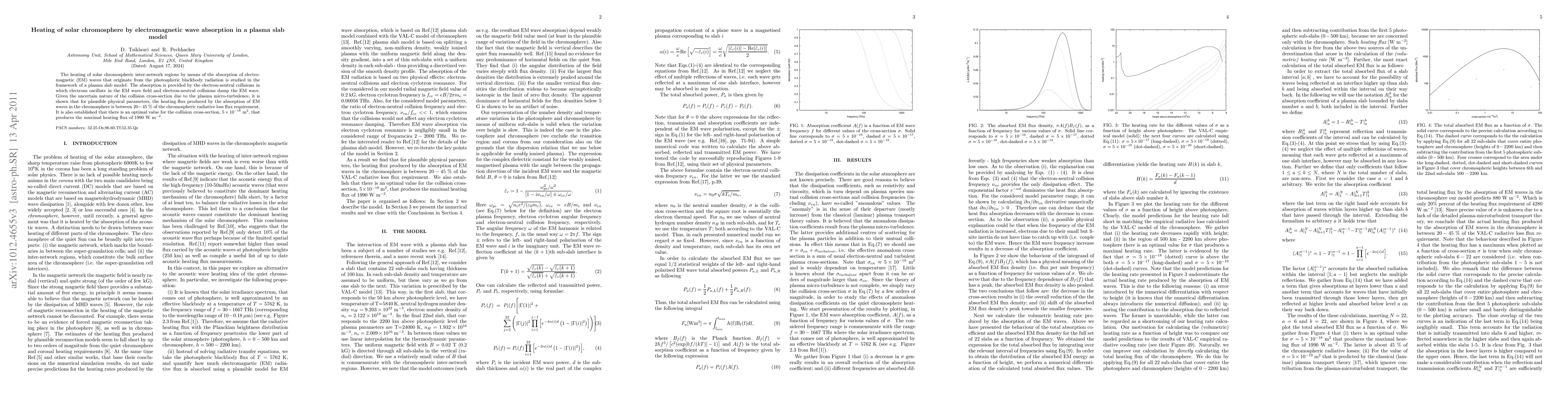 This paper investigates the heating of solar chromospheric inter-network regions via the absorption of electromagnetic waves from photospheric radiation, modeled in a plasma slab. It finds that EM wave absorption through electron-neutral collisions can provide heating flux between 20-45% of the chromospheric radiative loss, with an optimal collision cross-section of $5 \times 10^{-18}$ m$^{2}$ yielding a maximal heating flux of 1990 W m$^{-2}$.